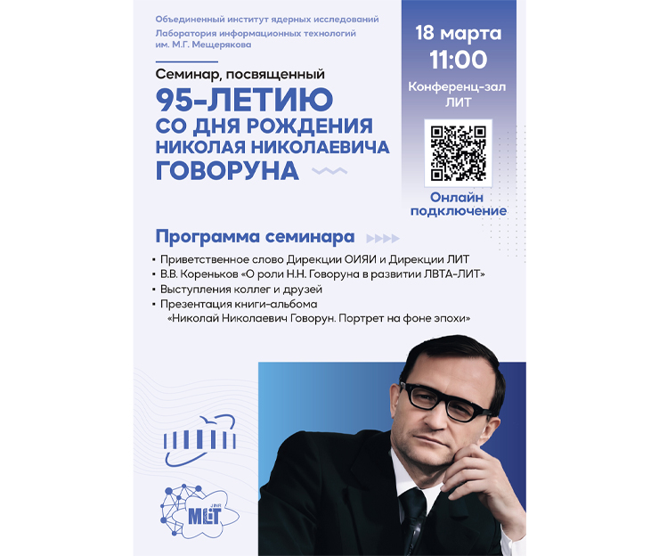 18 марта 2025 г. в 11:00 в конференц-зале Лаборатории информационных технологий им. М. Г. Мещерякова ОИЯИ состоится семинар, посвященный 95-летию со дня рождения Николая Николаевича Говоруна.