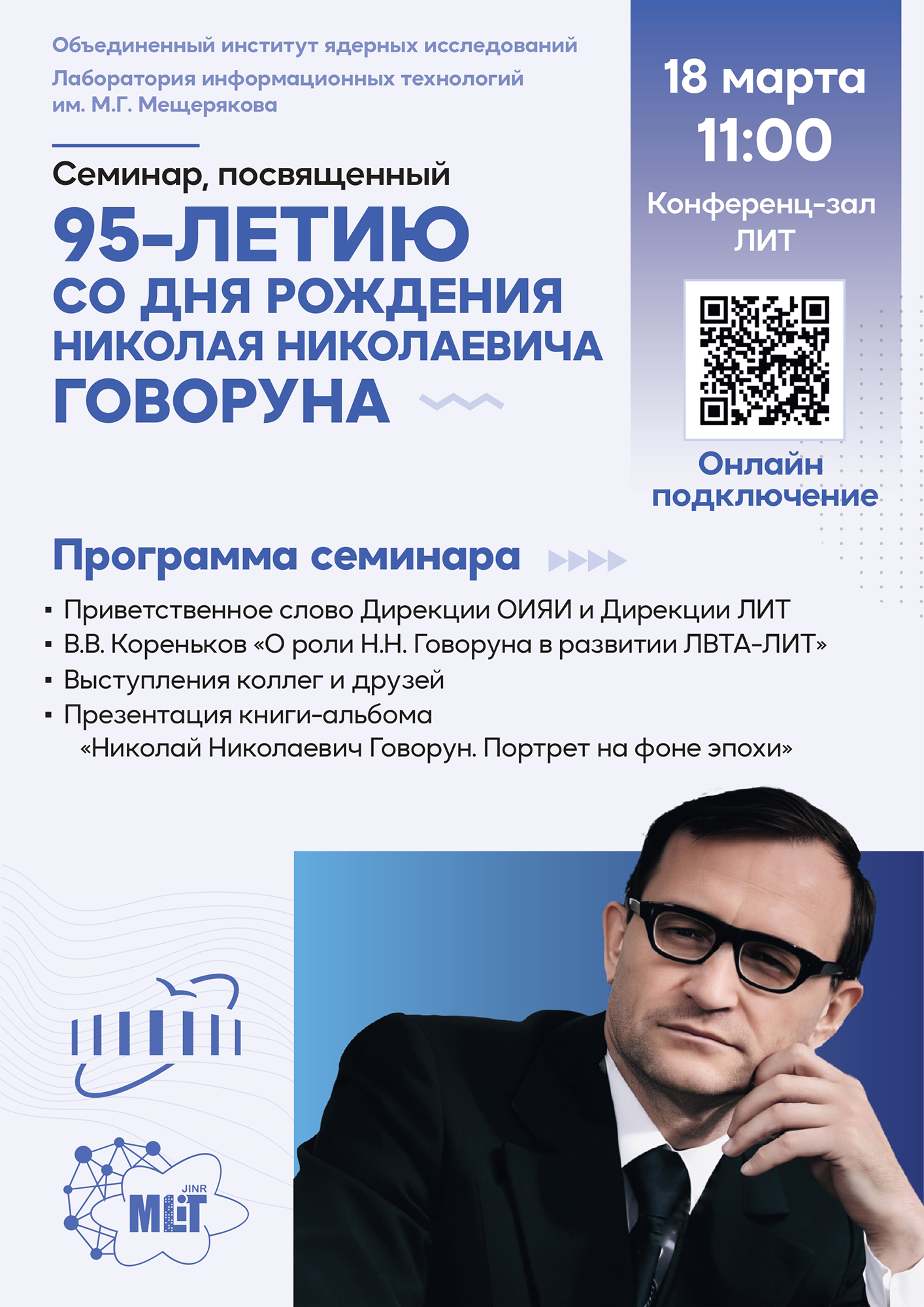 18 марта 2025 г. в 11:00 в конференц-зале Лаборатории информационных технологий им. М. Г. Мещерякова ОИЯИ состоится семинар, посвященный 95-летию со дня рождения Николая Николаевича Говоруна.