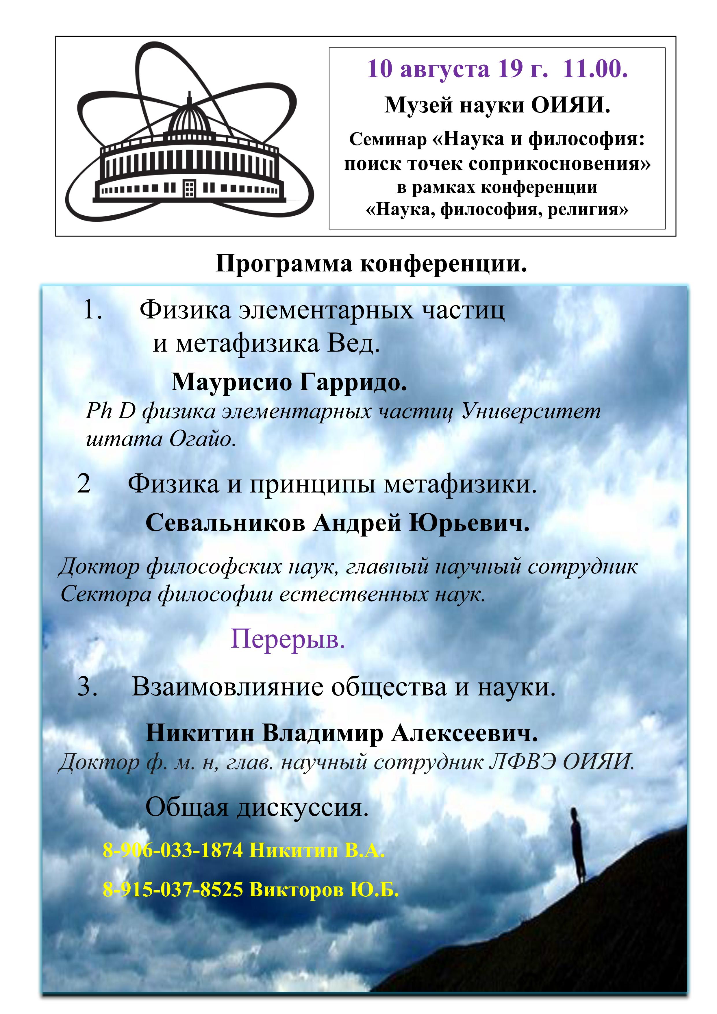 On 10 August 2019, at 11:00 AM, the seminar «Science and philosophy: finding common ground» will be held in the Museum of History of Science and Technology of JINR in frames of the conference “Science, Philosophy, Religion”.