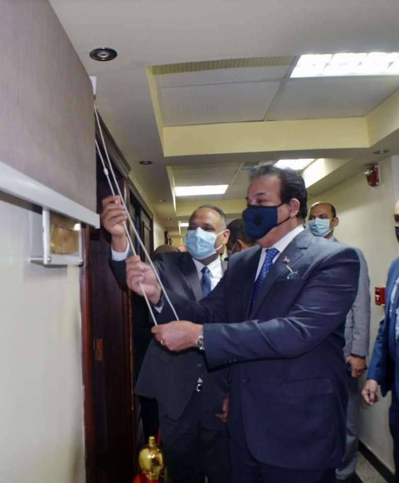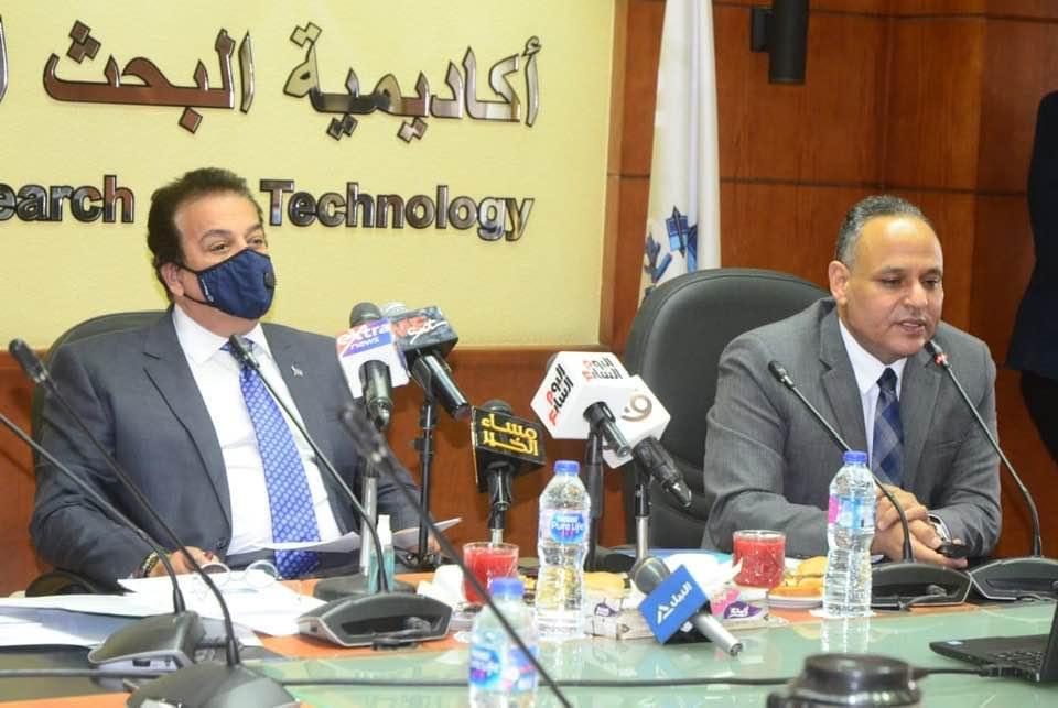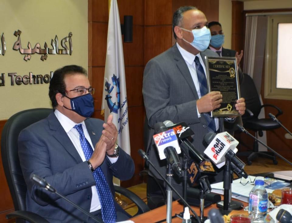Символическая передача ключа Академии научных исследований и технологий Египта. На фото (слева направо): Министр высшего образования и научных исследований Египта Халид Абдель Гаффар и Президент ASRT Махмуд Сакр