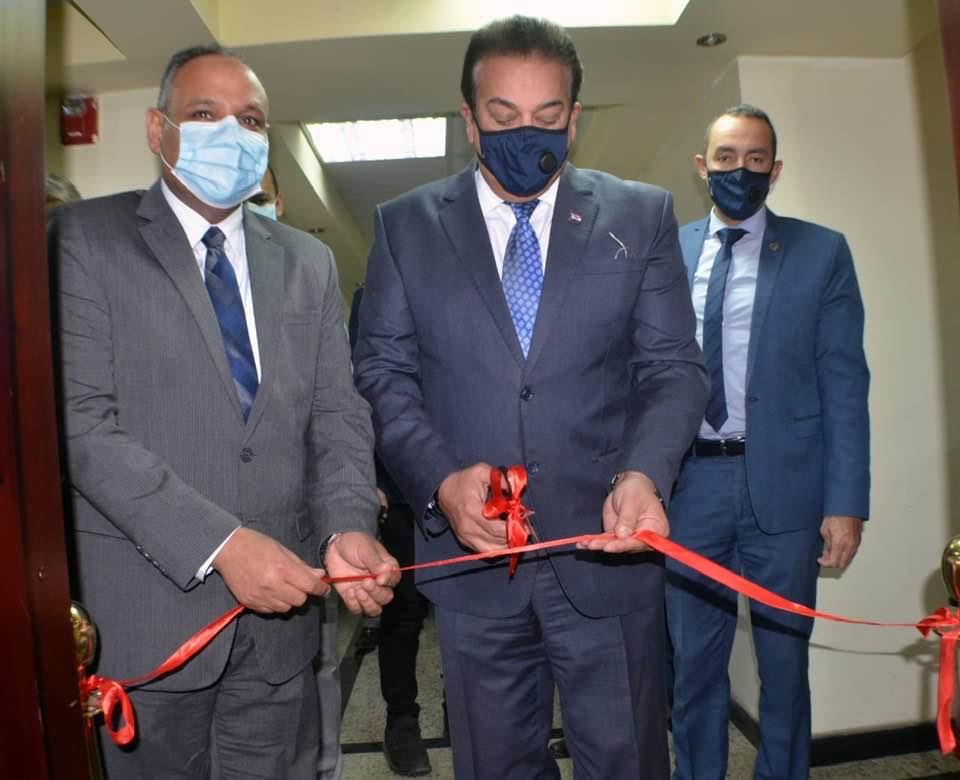На церемонии открытия Инфоцентра ОИЯИ в Академии научных исследований и технологий Египта. Махмуд Сакр и Халид Абдель Гаффар перерезают символическую красную ленту