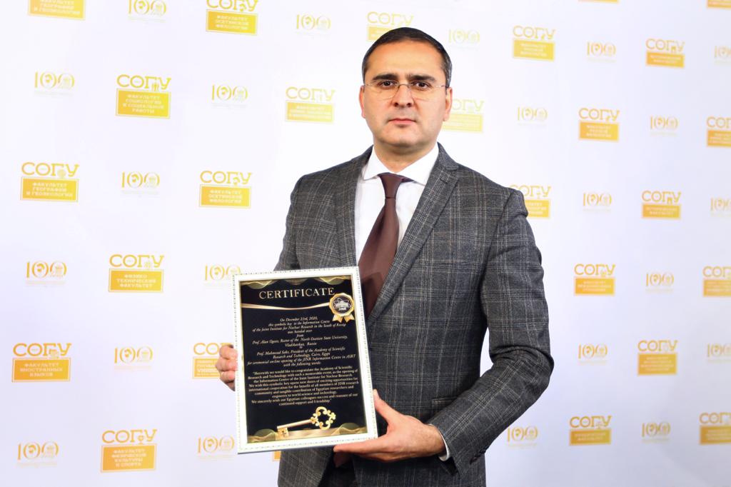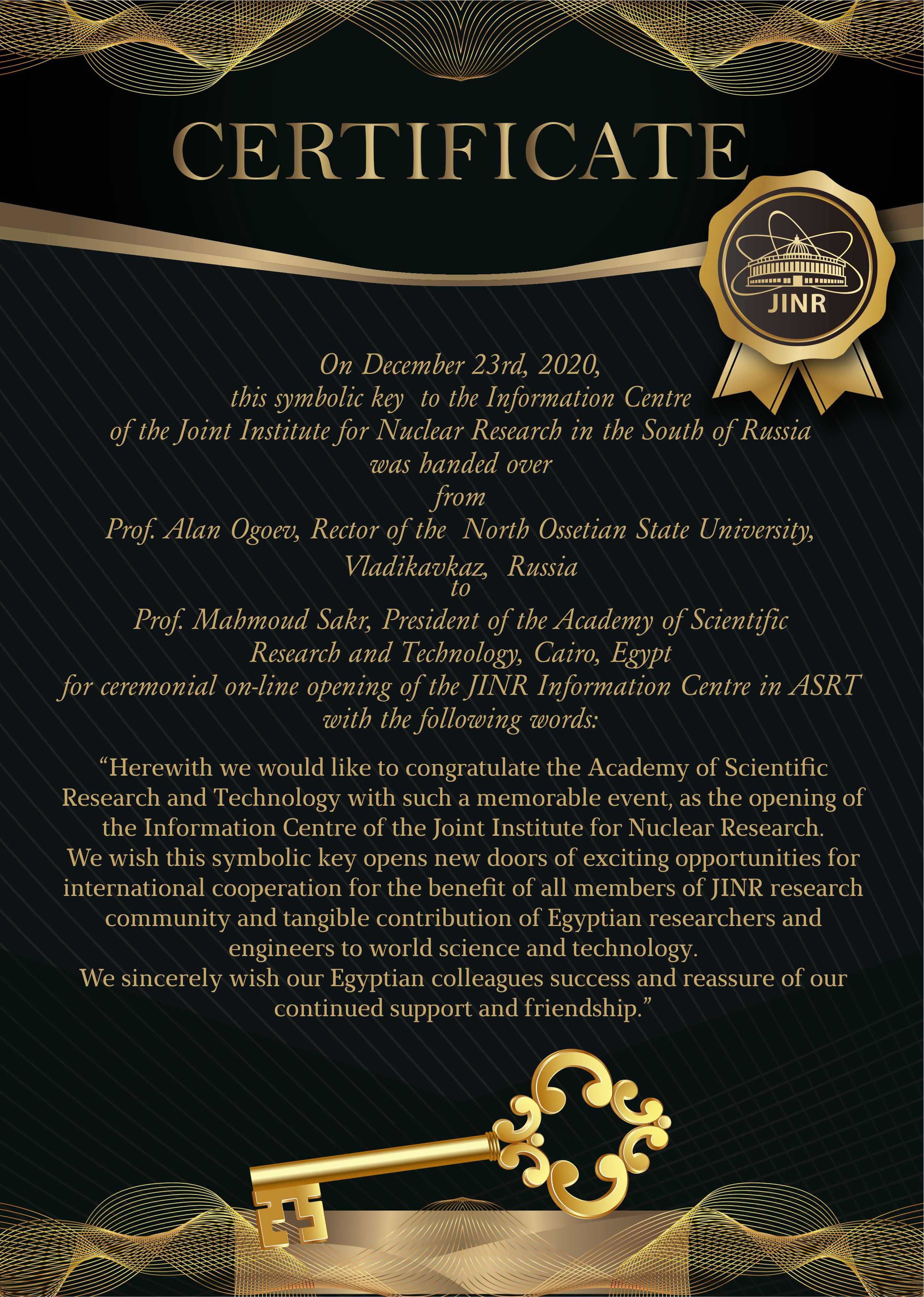 Алан Огоев, ректор СОГУ, на базе которого с 2018 года с успехом функционирует первый Инфоцентр ОИЯИ на юге России, передал cимволический ключ от ИЦ Академии научных исследований и технологий Египта.