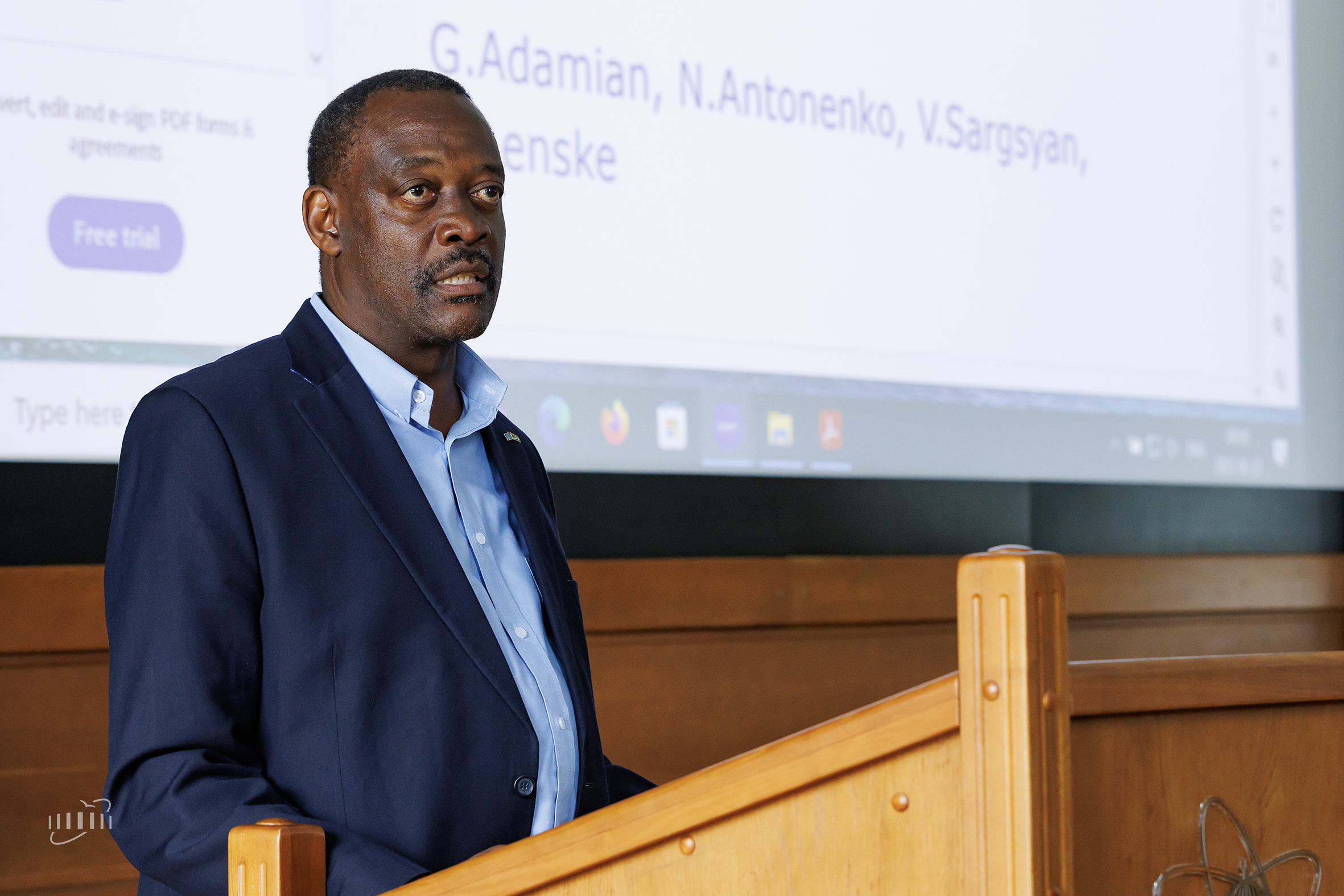 Открывая совещание, директор ЛТФ ОИЯИ Дмитрий Казаков подчеркнул важность взаимосвязи между теоретической и экспериментальной физикой. Со вступительным словом также выступили заместитель директора циклотронной лаборатории NRF: iThemba Labs Рудольф Нчоду, координатор сотрудничества со стороны ЮАР, и Мантиле Лесли Лекала (Университет Южной Африки). Профессор Лекала выразил надежду на то, что совещание будет способствовать развитию сотрудничества ОИЯИ – ЮАР, которое становится все более тесным. Он отметил, что с тех пор, как было подписано соглашение о взаимопонимании между ОИЯИ и ЮАР в 2005 году и проведено первое подобное совещание в 2007 году, было обучено более 500 студентов по всей Южной Африке. Директор Учебно-научного центра ОИЯИ Дмитрий Каманин поблагодарил руководство NRF: iThemba Labs за координацию сотрудничества ОИЯИ – ЮАР на протяжении многих лет. Он рассказал, что в этом году Объединенный институт принимает на работу шестерых аспирантов из ЮАР сроком на три года.
