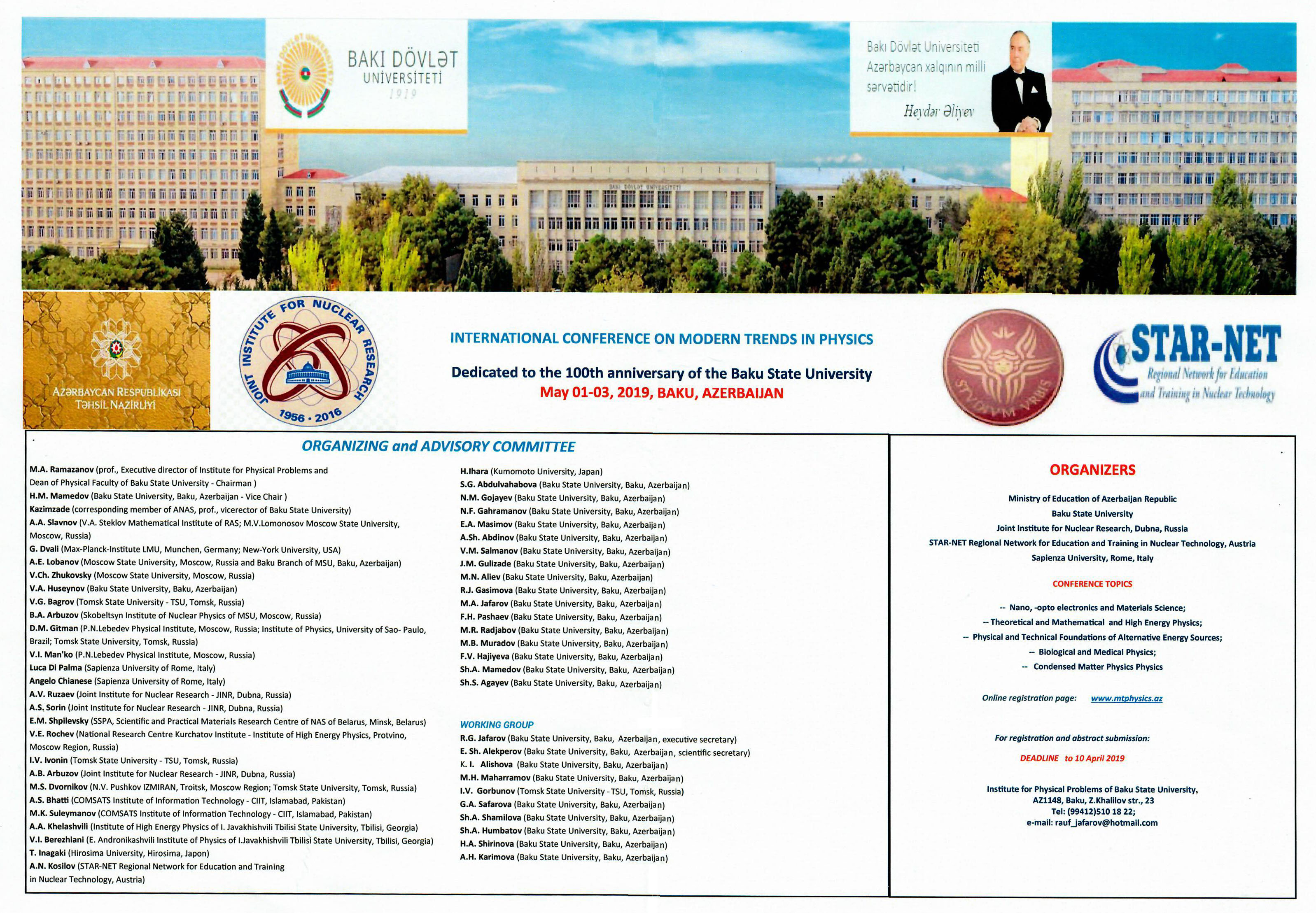 В Баку с 1 по 3 мая 2019 г. пройдет Международная научная конференция «Современные тенденции в физике», посвященная столетию Бакинского государственного университета. Организаторами конференции являются Министерство образования Азербайджанской Республики, Бакинский государственный университет, STAR-NET: региональная сеть «Образование и подготовка специалистов в области ядерных технологий», Объединенный институт ядерных исследований (Дубна, Россия) и университет Сапиенца (Рим, Италия).