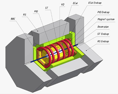 — Экспериментальная установка будет иметь геометрический аксептанс, близкий к 4, продвинутую систему восстановления треков и вершин, а также широкие возможности по идентификации частиц, основанные на современных технологиях. Кремниевый вершинный детектор (VD) обеспечит координатное разрешение при реконструкции вершины лучше 100 µm, что необходимо для реконструкции вторичных вершин распада D-мезонов. Трековая система, основанная на строу-трубках (ST), размещенная в соленоидальном магнитном поле до 1Т, позволит реконструировать поперечные импульсы вторичных частиц с точностью до 2%. Времяпролетная система (PID) с временным разрешением 60 пс обеспечит разделение пионов, каонов и протонов в широком кинематическом диапазоне. Возможное использование черенковских детекторов на основе аэрогеля позволит расширить этот диапазон. За регистрацию фотонов будет отвечать электромагнитный калориметр типа «шашлык» (ECal). Для уменьшения эффектов многократного рассеяния и конверсии фотонов минимизировано количество вещества во внутренней части установки. Мюонная (пробежная) система (RS) предназначена для идентификации мюонов. Она также может служить в качестве грубого адронного калориметра. Пара пучковых счетчиков (BBC) и калориметров нулевого угла (ZDC) будут отвечать за локальную поляриметрию и контроль светимости. Для минимизации возможных систематических эффектов SPD будет оснащен бестриггерной системой сбора данных. Высокая частота столкновений (до 4 МГц) и большое количество каналов электроники определяют высокие требования к системе сбора данных, онлайн-мониторингу, компьютерной системе последующей обработки данных и программному обеспечению для реконструкции и анализа данных.
