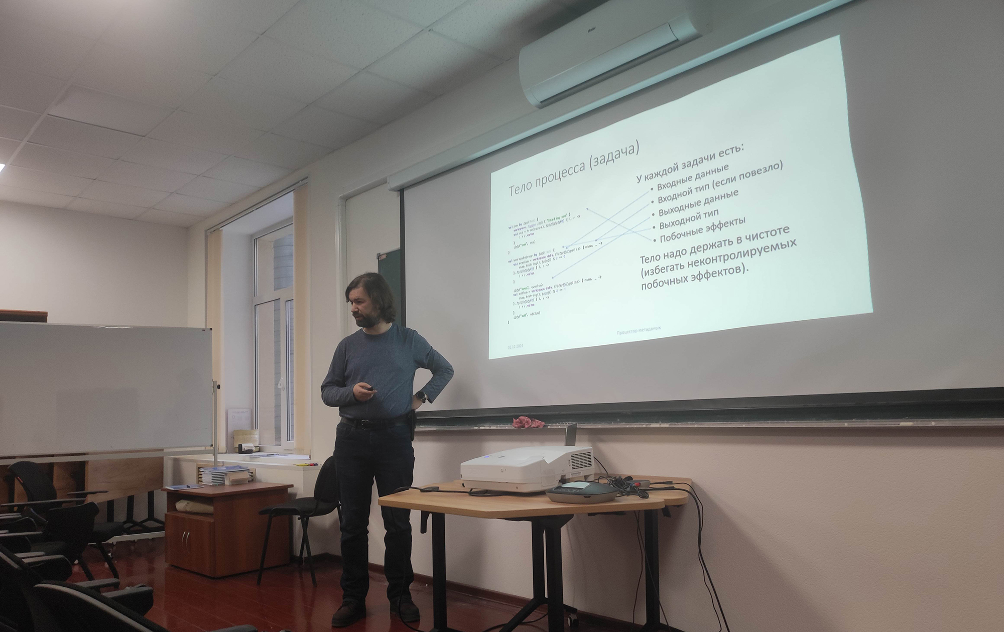 The first day’s programme continued with a presentation by a junior researcher at the Scientific and Educational Laboratory for Methods of Big Data Analysis (LAMBDA) at the Higher School of Economics (HSE) Evgeny Kurbatov on examples of applying machine learning methods to some data selection and classification tasks in the BM@N and SPD Experiments. MIPT Scientific Programming Centre Director Alexander Nozik discussed topical issues related to organizing work with data and proposed practical solutions to speed up analysis and reduce the time spent debugging programs.