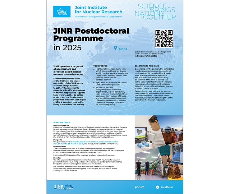 On 1 March 2025, the Joint Institute for Nuclear Research begins accepting applications for participation in the spring call of the international JINR Postdoctoral Programme. Young scientists from all over the world specialising in experimental particle physics and relativistic nuclear physics will be able to join JINR’s projects under a one-year contract with the opportunity of extending it for up to two more years.