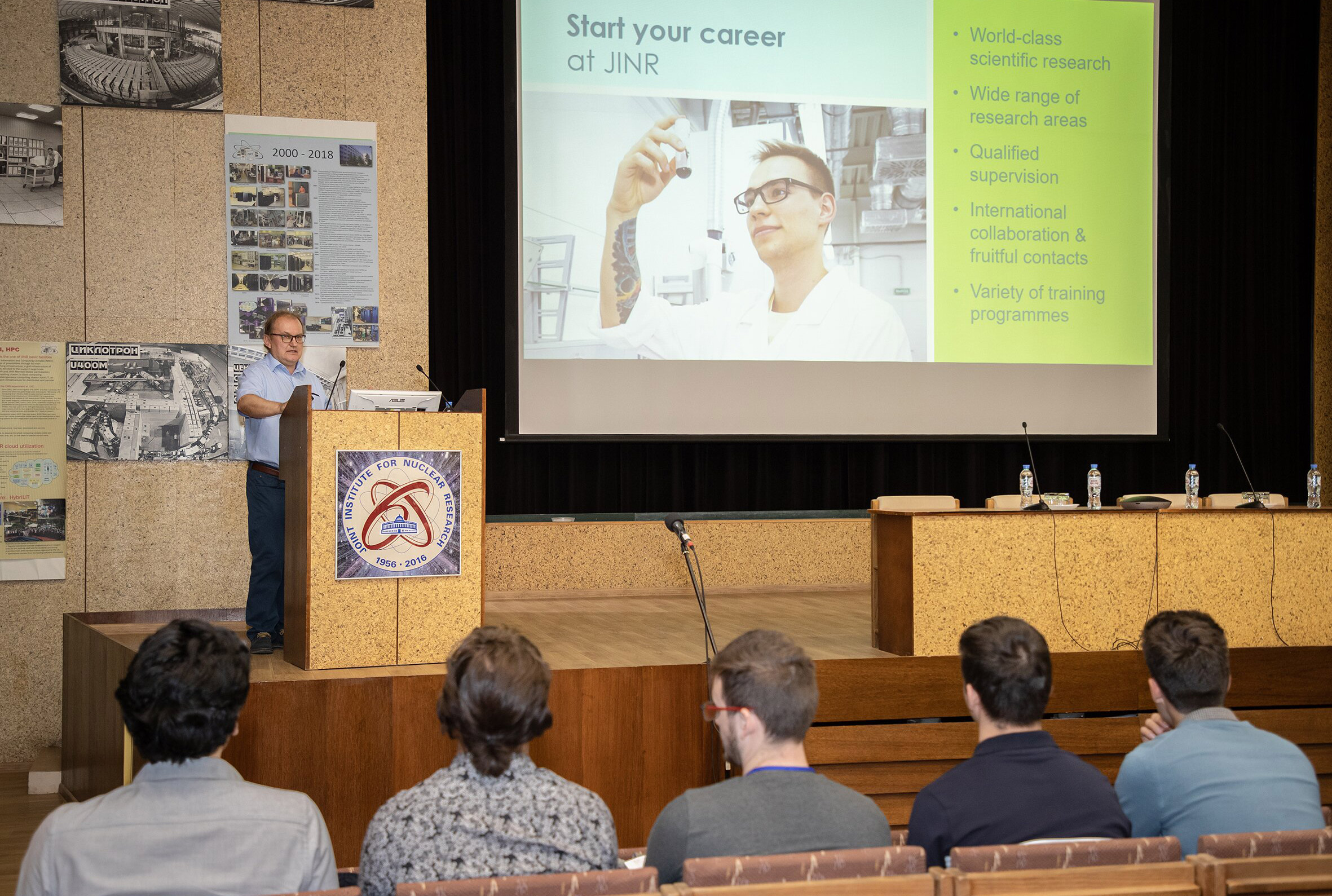 Традиционно первые дни практики отведены под знакомство студентов с Объединенным институтом. В первый день практиканты прослушали лекции о ведущихся в лабораториях ОИЯИ исследованиях. Обзорные лекции об ОИЯИ и его возможностях представили начальник Отдела международных связей Дмитрий Каманин и директор УНЦ Станислав Пакуляк. О научной деятельности своих лабораторий рассказали научный сотрудник Лаборатории радиационной биологии Мария Лалковичова, а также старший научный сотрудник Лаборатории теоретической физики Андрей Пикельнер.