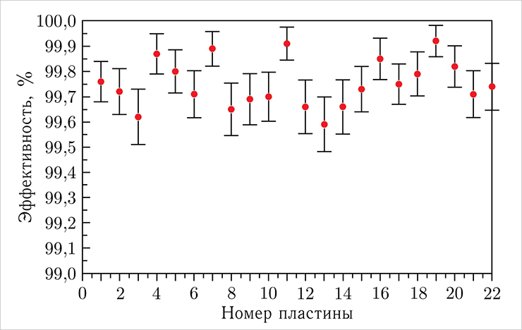 Значения эффективности регистрации космических мюонов для выборки из 22 сцинтилляционных пластин