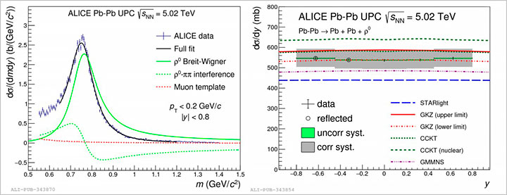 Left: Invariant mass distribution fit of pion pairs; Right: Cross-section for the photoproduction of ρ0 in ultra-peripheral Pb–Pb collisions and corresponding theoretical calculations