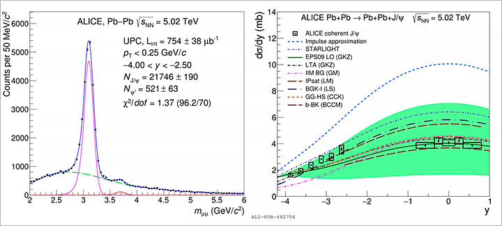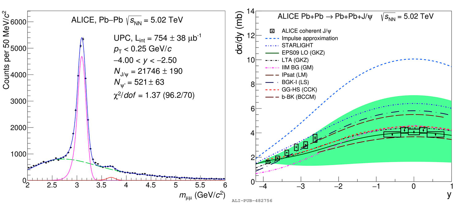Left: Dimuon mass spectrum fit; Right: measured cross-section for the coherent J/ ψ photoproduction and theoretical calculations