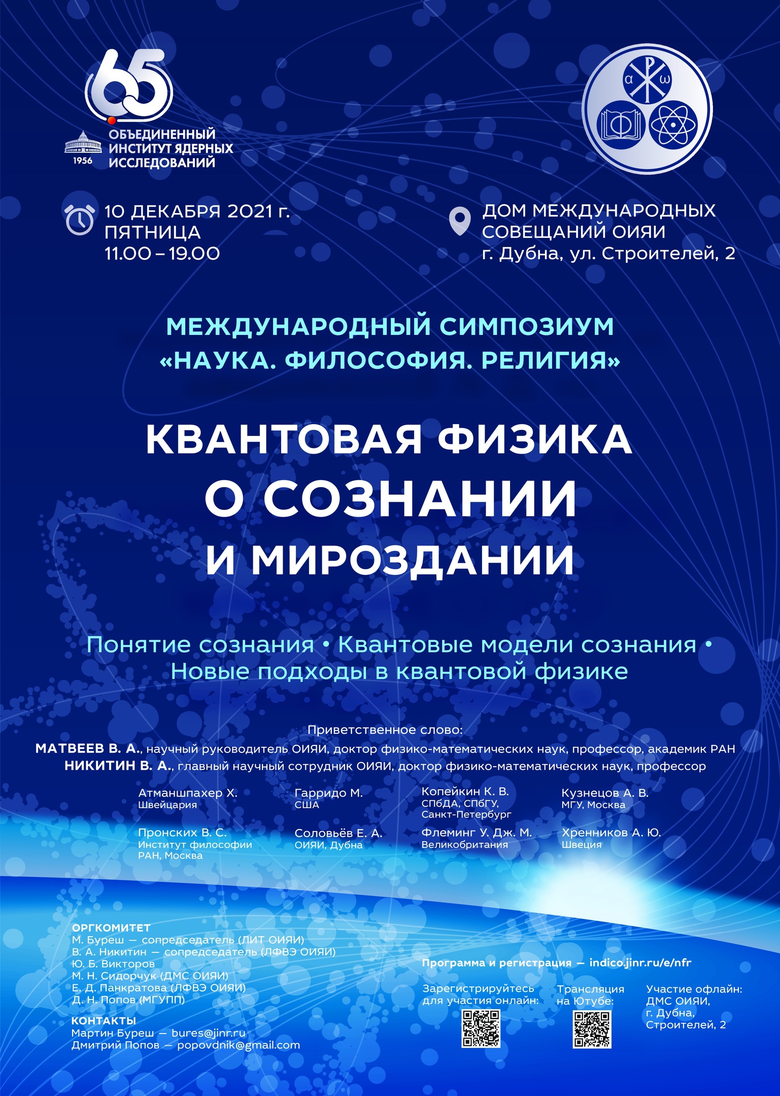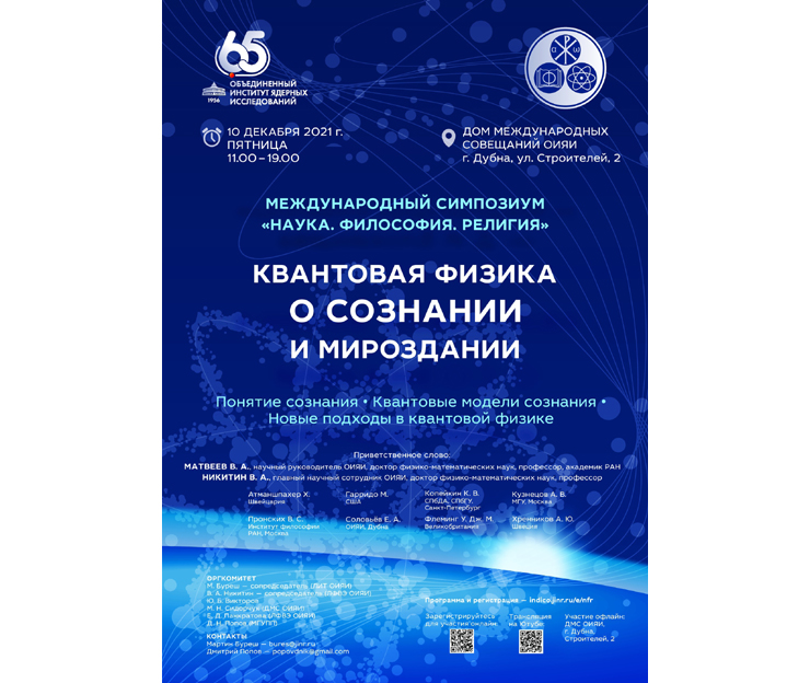 On 10 December 2021, a symposium “Science. Philosophy. Religion.” will take place in the JINR International Conference Hall in Dubna. The event will continue the tradition of successful conferences held for many years in Dubna.