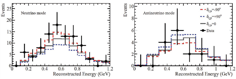 T2K released a result analysing data with 1.49×1021 and 1.64×1021 protons from the accelerator for neutrino beam mode and antineutrino beam mode respectively. If the parameter δcp equals 0° or 180°, the neutrinos and antineutrinos will change their types (from muon to electron) in the same way during oscillation. The δcp parameter may have a value that enhances the oscillations of neutrinos or antineutrinos, breaking CP symmetry. However, the observation of neutrinos is already enhanced in the T2K experiment by the fact that the detectors and beam line components are made out of matter and not antimatter. To separate the effect of δcp from known beam line and interaction effects, the T2K analysis includes corrections based on data from magnetized near detectors (ND280) placed 280m from the target. T2K observed 90 electron neutrino candidates and 15 electron antineutrino candidates. T2K expects to observe 82 electron neutrino events compared to 17 electron antineutrino events for maximal neutrino enhancement (δcp =−90°) and 56 electron neutrino events compared to 22 electron antineutrino events for maximal antineutrino enhancement (δcp=+90°). The observed number of events as a function of the reconstructed neutrino energy is shown below. The T2K data is most compatible with a value close to δcp=−90° that significantly enhances the oscillation probability of neutrinos in the T2K experiment. Using this data, T2K evaluates confidence intervals for the parameter δcp. The disfavored region at the 3σ (99.7%) confidence level is −2° to 165°. This result represents the strongest constraint on δcp to date. The values of 0° and 180° are disfavored at 95% confidence level, which was the case in T2K’s previous release in 2017, indicating that CP symmetry may be violated in neutrino oscillations.