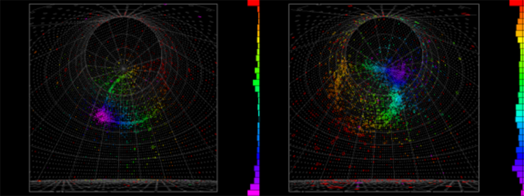 Fig.2 Event displays of candidate electron neutrino (left) and electron antineutrino (right) events observed in Super-K from the T2K neutrino beam. When an electron neutrino or antineutrino interacts with water, an electron or positron is produced. They emit a faint ring pattern light, which is detected by about 11,000 photo-sensors. The color in the displays represents the photon detection timing.