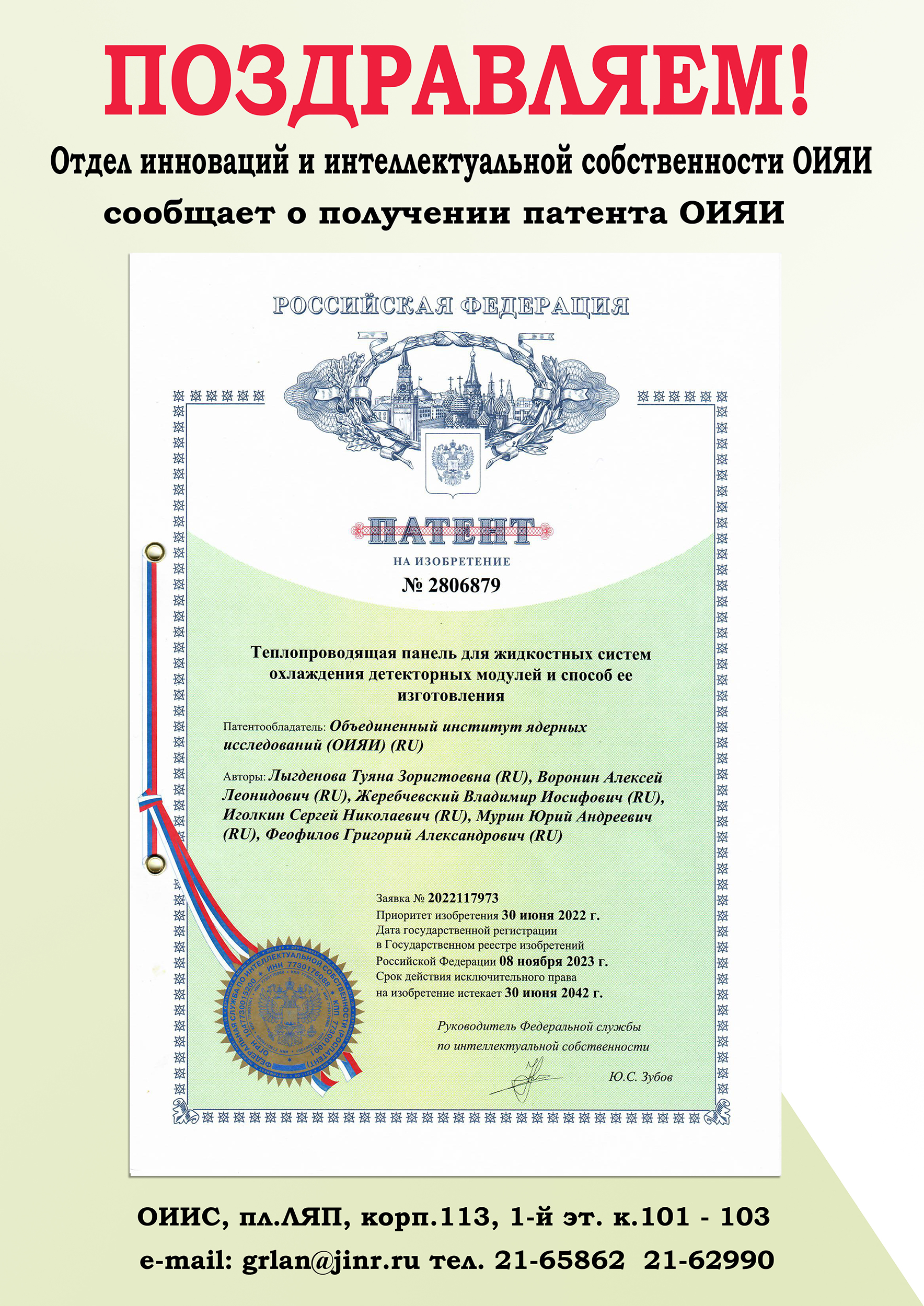 До публикации статьи о своей научно-технической разработке сотрудники ОИЯИ могут обратиться в Отдел инноваций и интеллектуальной собственности для оформления заявки на патент.