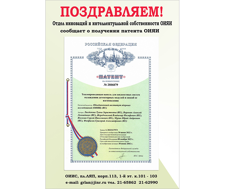 Отдел инноваций и интеллектуальной собственности ОИЯИ сообщает, что 8 ноября 2023 года Объединенным институтом ядерных исследований был получен патент на изобретение «Теплопроводящая панель для жидкостных систем охлаждения детекторных модулей и способ ее изготовления». Авторы работы — ученые ЛФВЭ ОИЯИ и СПбГУ: Туяна Лыгденова, Алексей Воронин, Владимир Жеребчевский, Сергей Иголкин, Юрий Мурин, Григорий Феофилов.
