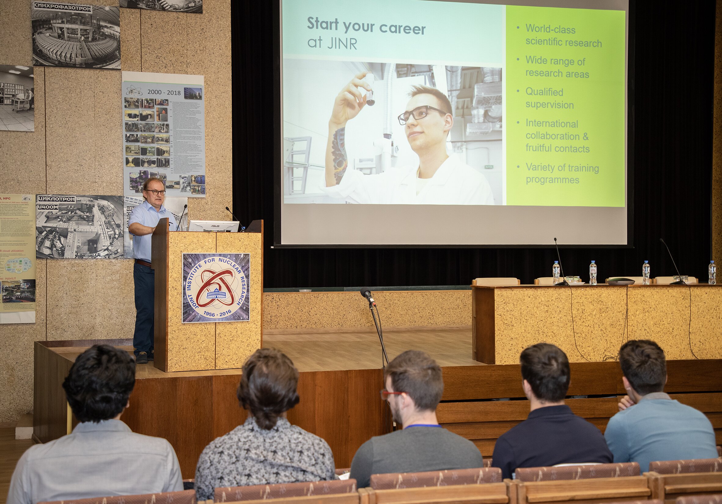 Following the tradition, the first days of the Practice are devoted to the acquaintance of students with the Joint Institute. On the first day, participants heard lectures about research conducted in the JINR laboratories. Overview lectures about JINR and its opportunities were delivered by Head of the JINR International Cooperation Department Dmitry Kamanin and UC Director Stanislav Pakuliak. Researcher of the Laboratory of Radiation Biology Maria Lalkovičová and Senior Researcher of the Laboratory of Theoretical Physics Andrey Pikelner told to students about activities of their laboratories.