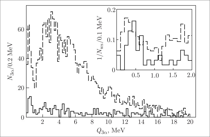 Distribution of the number of 3α-triples N over invariant mass Q in 316 “white” stars 12C → 3α (solid) and 641 “white” stars 16O → 4α (dashed) at 3.65A GeV; in inset, enlarged part Q < 2 MeV normalized to the numbers of “white” stars Nws