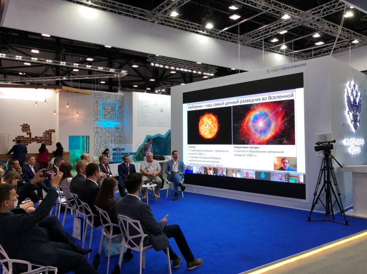 The Panel discussion “Neutrinos: elusive carriers of the secrets of the Universe” took place on 5 June at the exhibition stand of the Ministry of Science and Higher Education of Russia at SPIEF-2021. Participants discussed current tasks of neutrino physics, the role of neutrinos in cosmology, international neutrino experiments with the participation of Russian scientists, and the establishment of a new neutrino programme that would engage biologists, doctors, mathematicians, mechanical and power engineers.