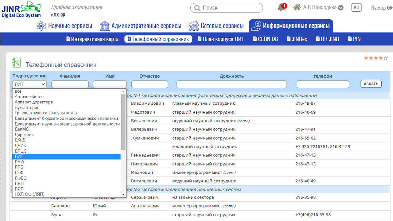 Сейчас у каждого сотрудника ОИЯИ несколько личных кабинетов в системах, в которых он работает. Цифровая экосистема – это единое окно в них. Всё собрано в одном месте по одному логину: кадровая, финансовая информация, заказ различных административных справок. Причем это как общие, так и научные, и административные сервисы. В обозримом будущем это позволит существенно уменьшить количество согласований и хождений с бумагами.