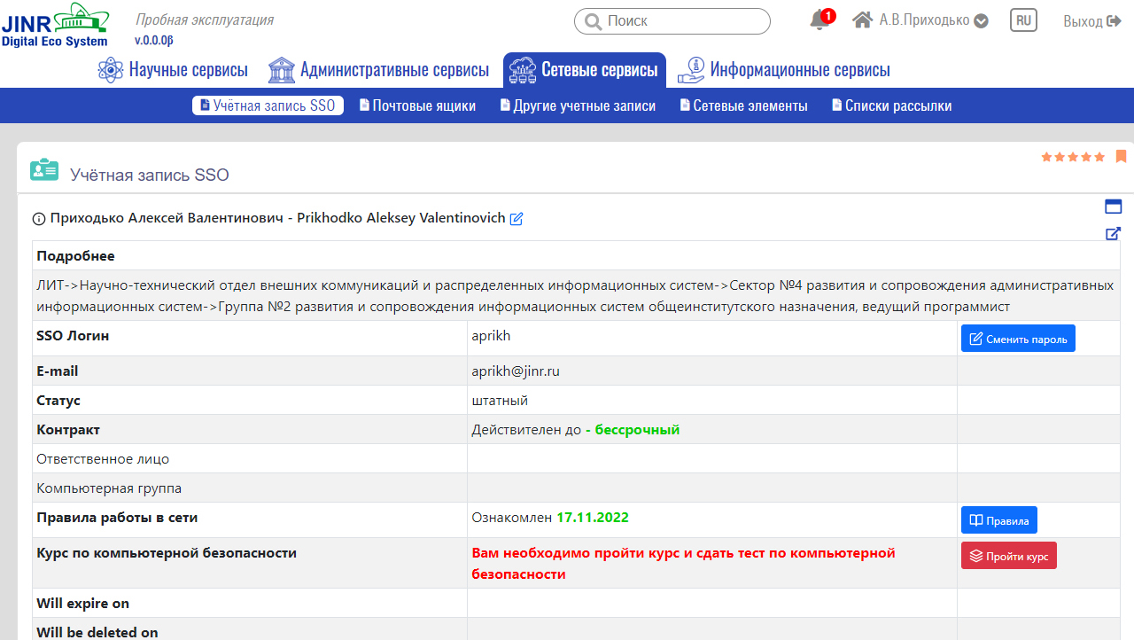 – Часть сервисов открыта для всех. Полными возможностями системы могут воспользоваться сотрудники ОИЯИ и ассоциированный персонал. При поступлении на работу каждый сотрудник получает учетную запись Single Sign-On — SSO — технологию единого входа. Эта учетная запись позволяет зайти в Цифровую экосистему ОИЯИ. В идеале, после того как пользователь зарегистрировался, он должен любые справки, информацию, любую заявку получить, не ходя по кабинетам. Пока до этого еще далеко, но первые шаги сделаны. Мы поставили себе цель постепенно решать все эти задачи.