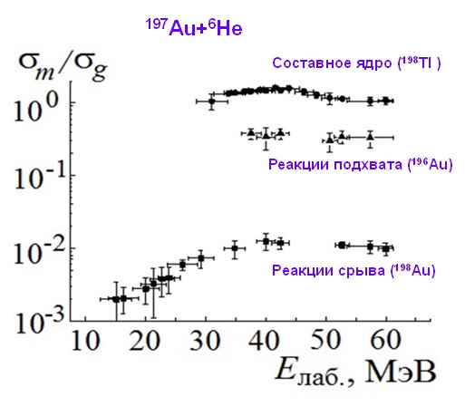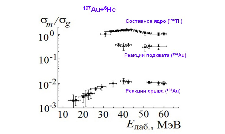 Первые эксперименты на пучках 6Не при взаимодействии с 197Au показали, что измеренные сечения реакций слияния и передачи вблизи кулоновского барьера значительно выше, чем полученные ранее в реакциях с α-частицами (4Не). С более высокой вероятностью в этих реакциях наблюдались выходы ряда изотопов, образовавшихся как в реакциях слияния, так и в реакциях передачи.