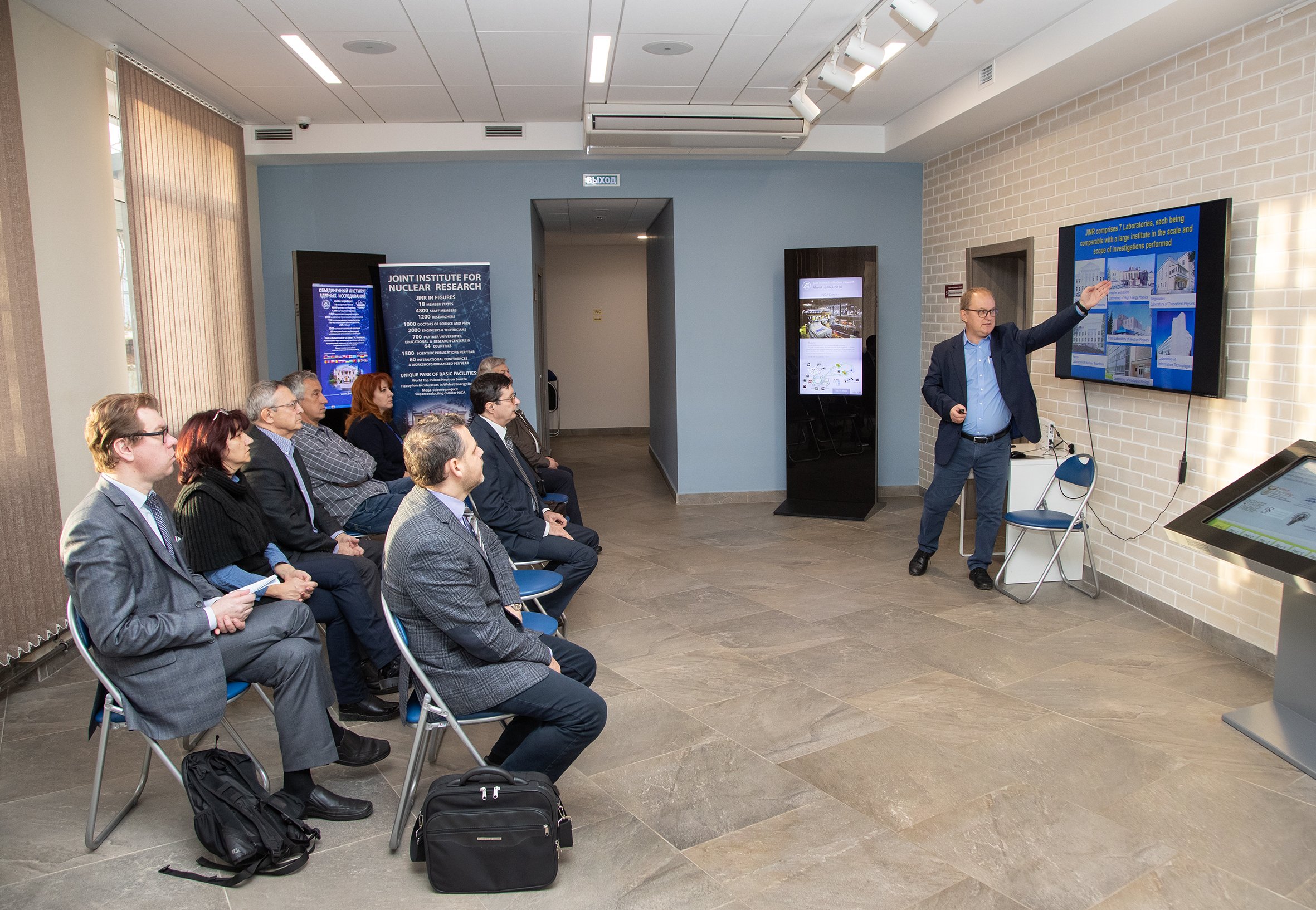 По традиции, официальный старт стажировки был дан в Визит-центре ОИЯИ, и первыми впечатлениями от знакомства с Институтом участники поделились на рабочем обеде с руководством ОИЯИ, где их приветствовали вице-директора Б. Ю. Шарков и Р. Ледницки.