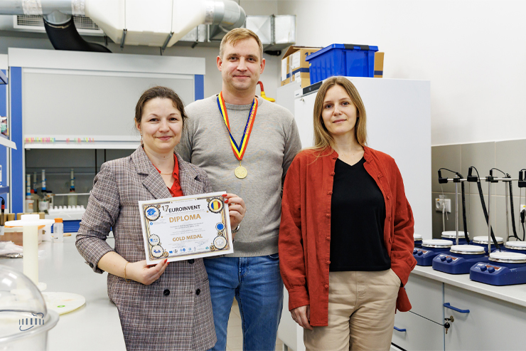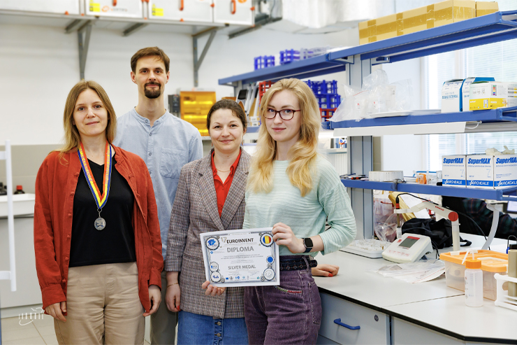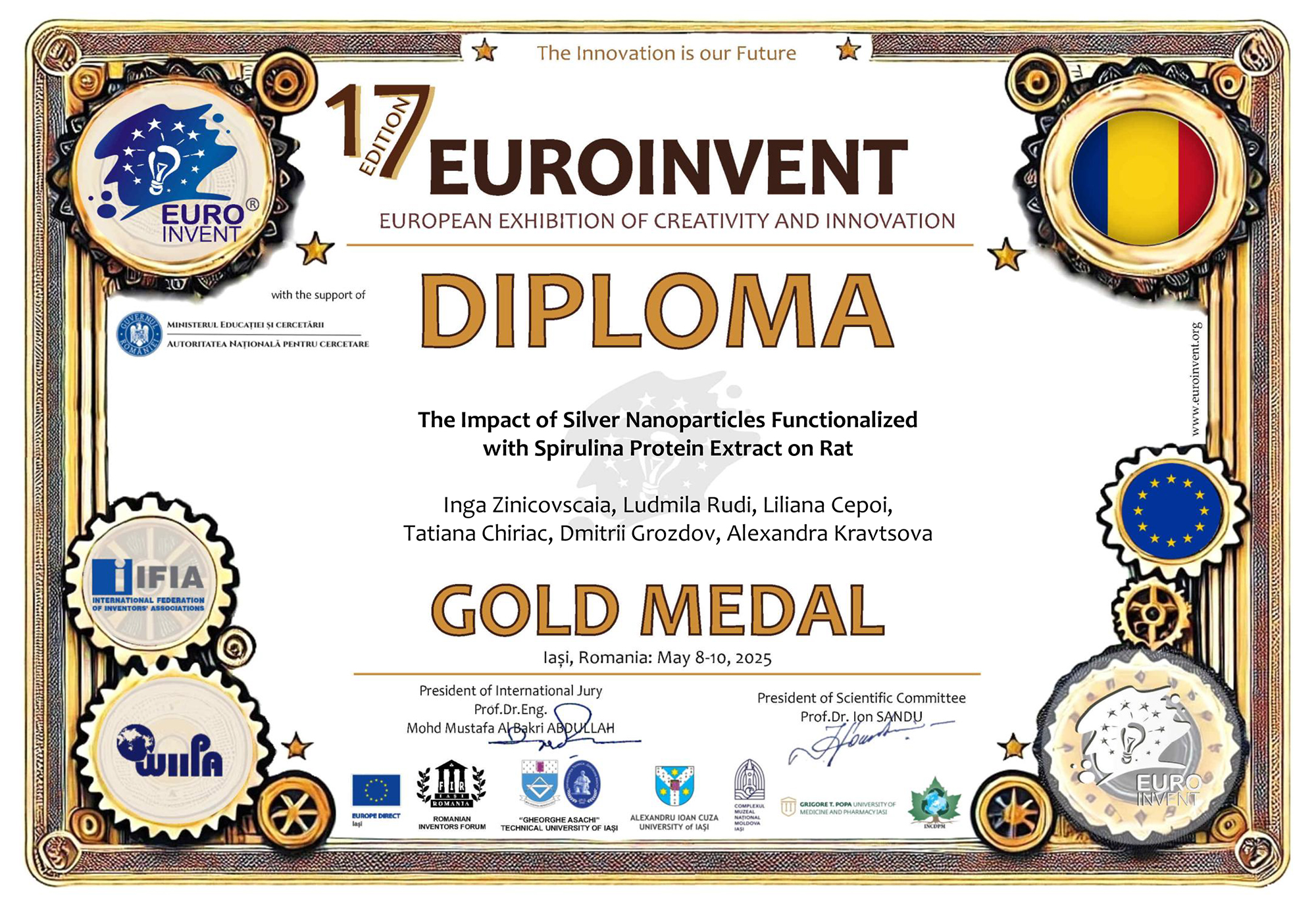 Инга Зиньковская, Дмитрий Гроздов и Александра Кравцова были удостоены золотой медали за исследование биосовместимости и физиологического воздействия наночастиц серебра, функционализированных экстрактом белка спирулины, с помощью лабораторных крыс.