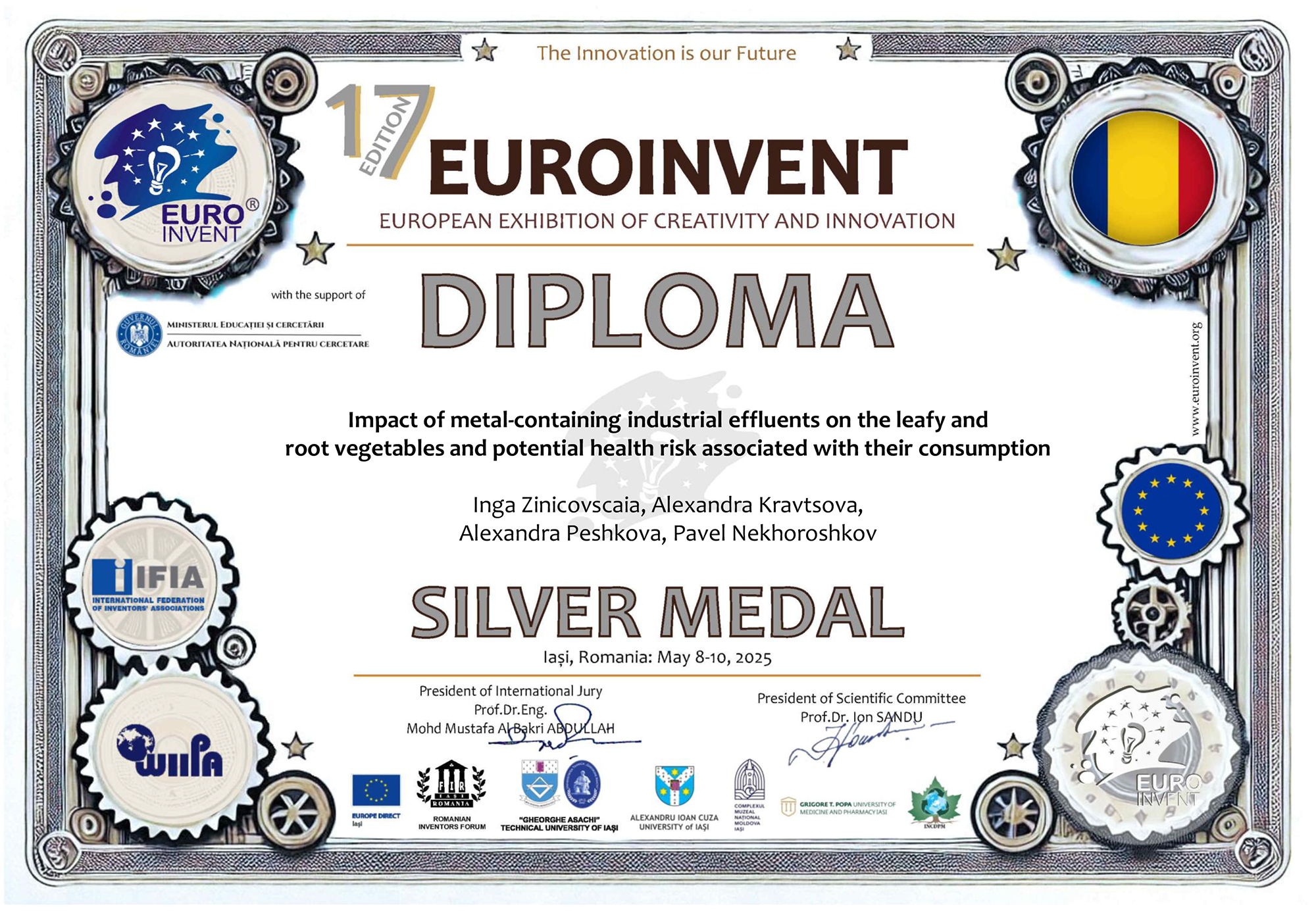 Инга Зиньковская, Александра Кравцова, Александра Пешкова и Павел Нехорошков получили серебряную медаль за исследование влияния промышленных стоков, содержащих металлы, на листовые и корнеплоды, а также риск для здоровья, связанный с их употреблением.