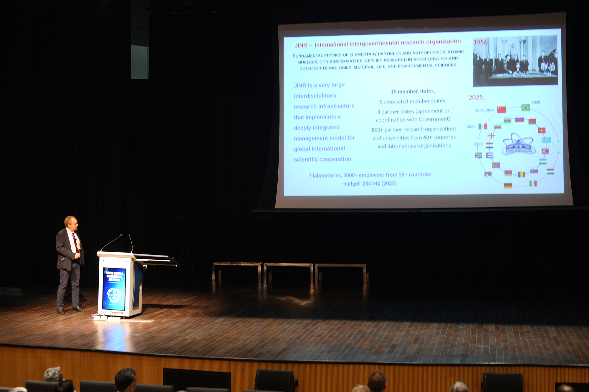 Главный ученый секретарь ОИЯИ Сергей Неделько рассказал о крупной научно-исследовательской инфраструктуре Института и перспективах его развития как международной межправительственной организации. Ведущие ученые Объединенного института представили текущие направления исследований и научные программы коллабораций на базе ОИЯИ: MPD (Виктор Рябов), SPD (Алексей Гуськов) и BM@N (Сергей Мерц) на комплексе NICA, Фабрику сверхтяжелых элементов и проект DRIBs-III (Сергей Сидорчук и Александр Карпов), нейтринный телескоп Baikal-GVD (Баир Шайбонов), а также исследования КХД на решетке (Виктор Брагутa) и другие.