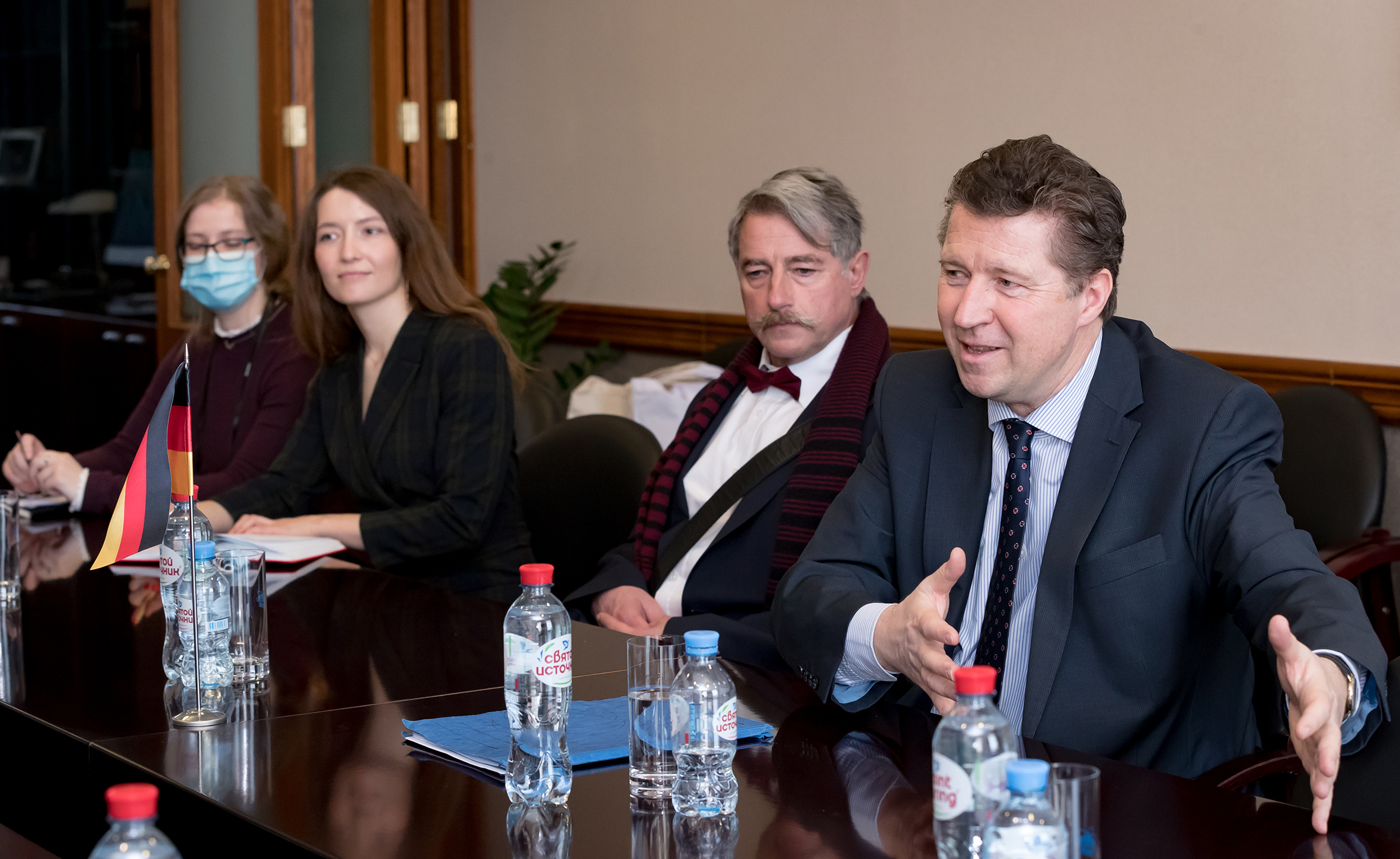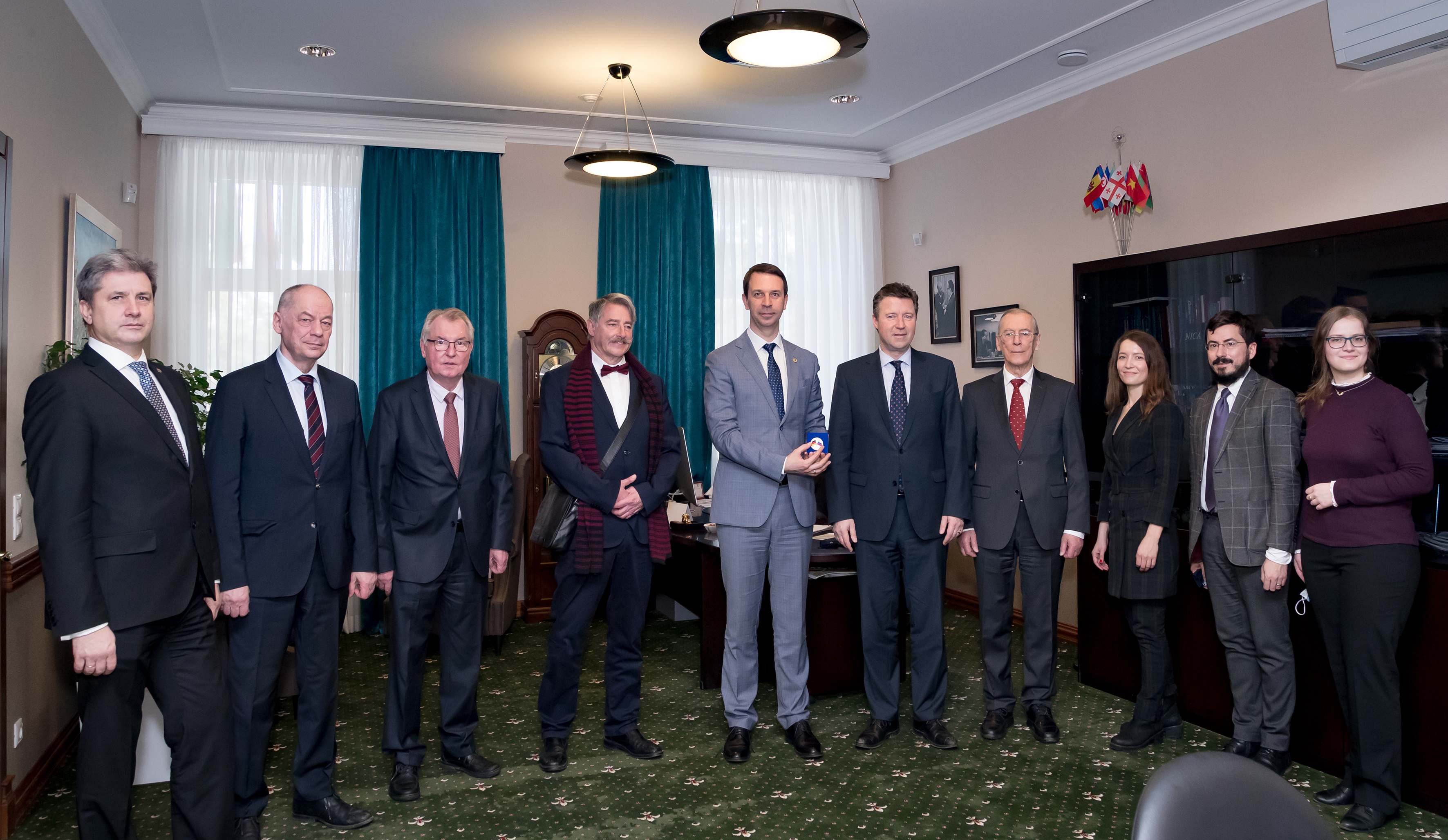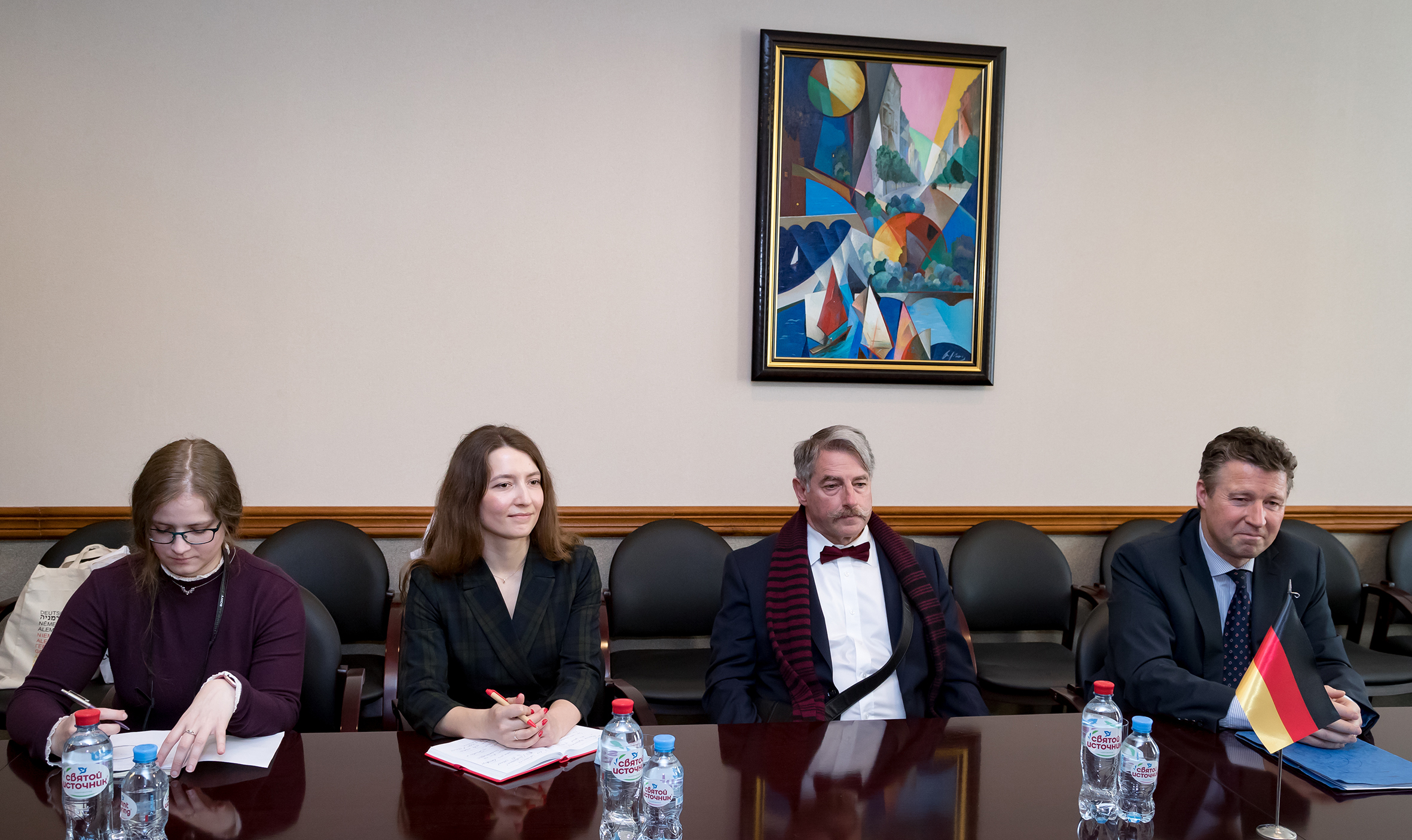 На фото справа налево: Геза Андреас фон Гайр, Чрезвычайный и Полномочный Посол Германии в Российской Федерации, Маттиас Фишер, руководитель Департамента экономики и науки, Марина Пиминова, представляющая Отдел науки, Фредерике Шмиц из Департамента экономики и науки