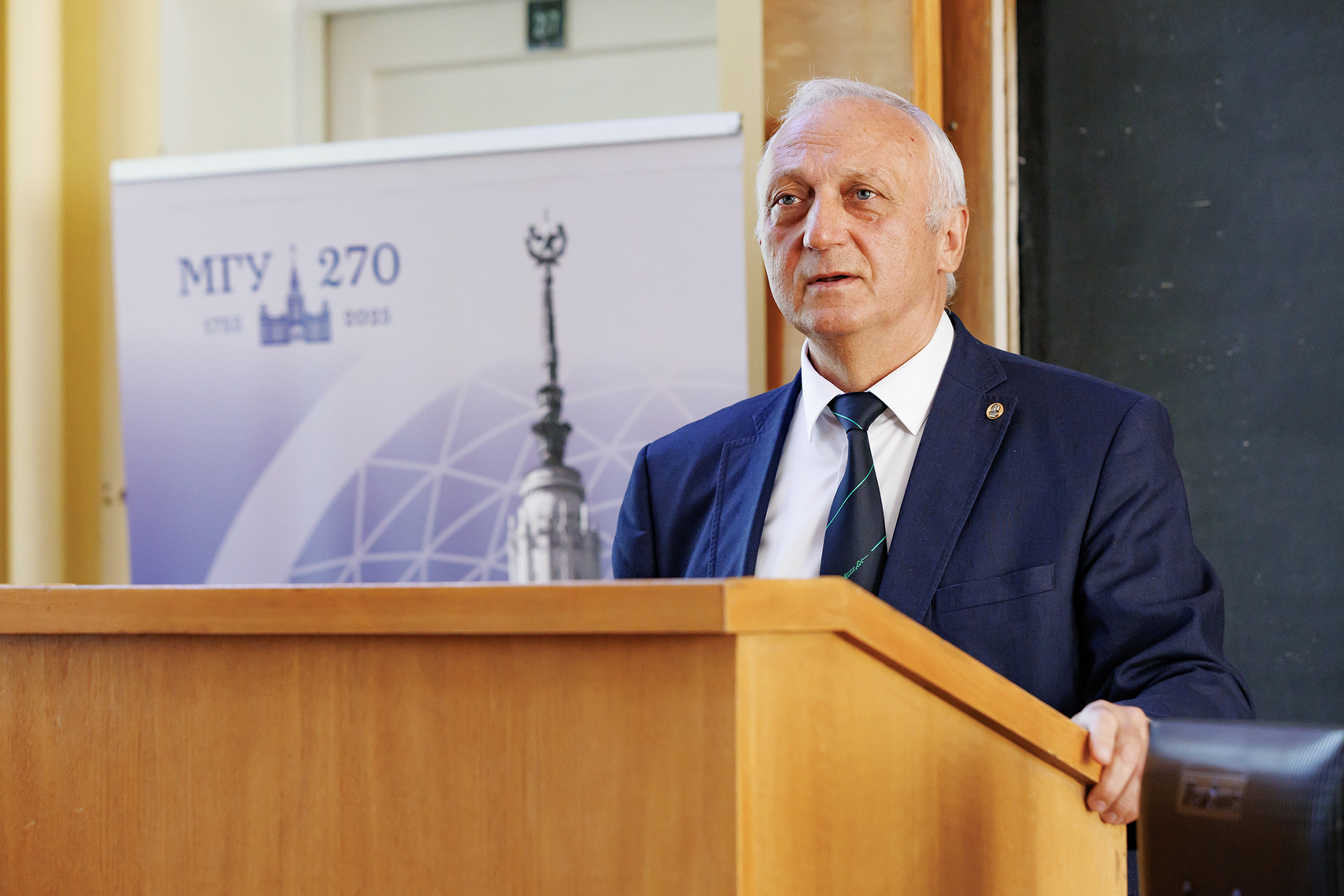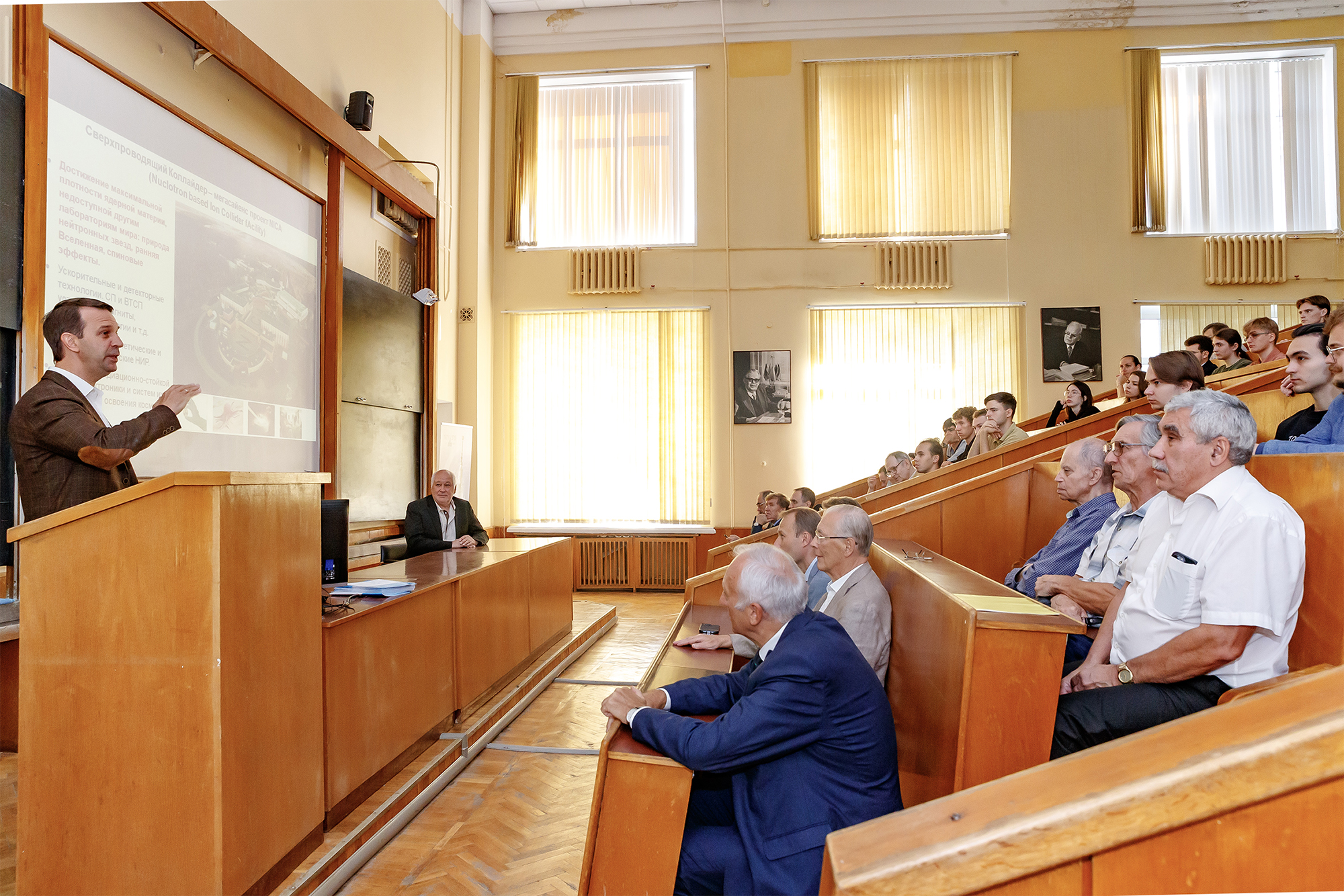 С презентацией, посвященной современным проектам и исследованиям ОИЯИ, а также истории научного и образовательного сотрудничества между Московским университетом и Объединенным институтом, выступил директор ОИЯИ, руководитель программы «Фундаментальная и прикладная ядерная физика» в филиале МГУ в Дубне, академик РАН Григорий Трубников. Он представил основные направления научной программы Института и рассказал о достижениях каждой из семи лабораторий.