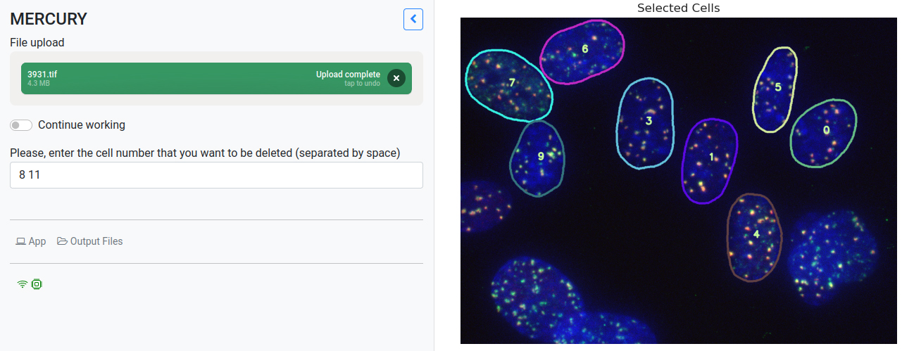 Для обнаружения РИФ на флуоресцентных изображениях MOSTLIT использует двухэтапный алгоритм, основанный на методах компьютерного зрения и глубокого обучения. Такой подход позволяет значительно ускорить обработку данных, свести к минимуму ошибки, связанные с человеческим фактором, и получить изображения отдельных клеток с выявленными фокусами. Кроме того, веб-сервис предоставляет исходные изображения с пронумерованными клетками и аналитическую информацию, такую как площадь клеток, количество РИФ в каждой клетке и др. Все результаты доступны для скачивания в удобном текстовом формате, обеспечивая тем самым гибкость и совместимость с различными программными средствами статистической обработки данных.