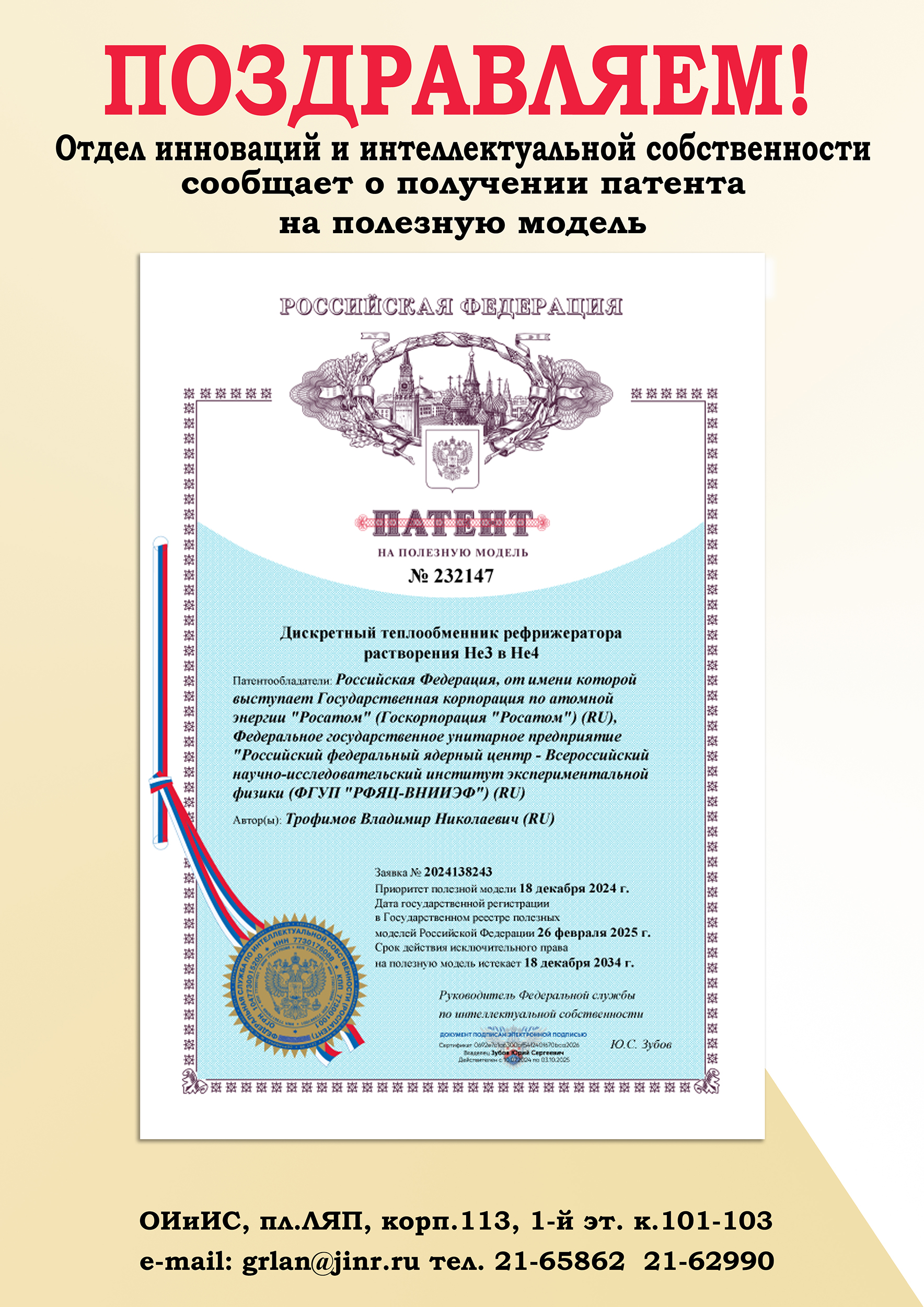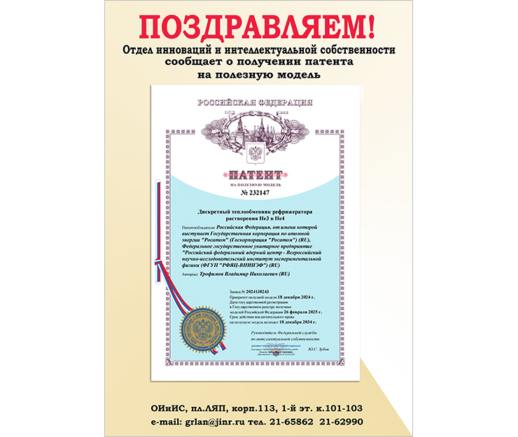 Патентообладателем является Российская Федерация, от имени которой выступает Госкорпорация «Росатом», Российский федеральный ядерный центр — Всероссийский научно-исследовательский институт экспериментальной физики. Патент RU 232147 на полезную модель «Дискретный теплообменник рефрижератора растворения 3Не в 4Не» был получен 26 февраля 2025 года.
