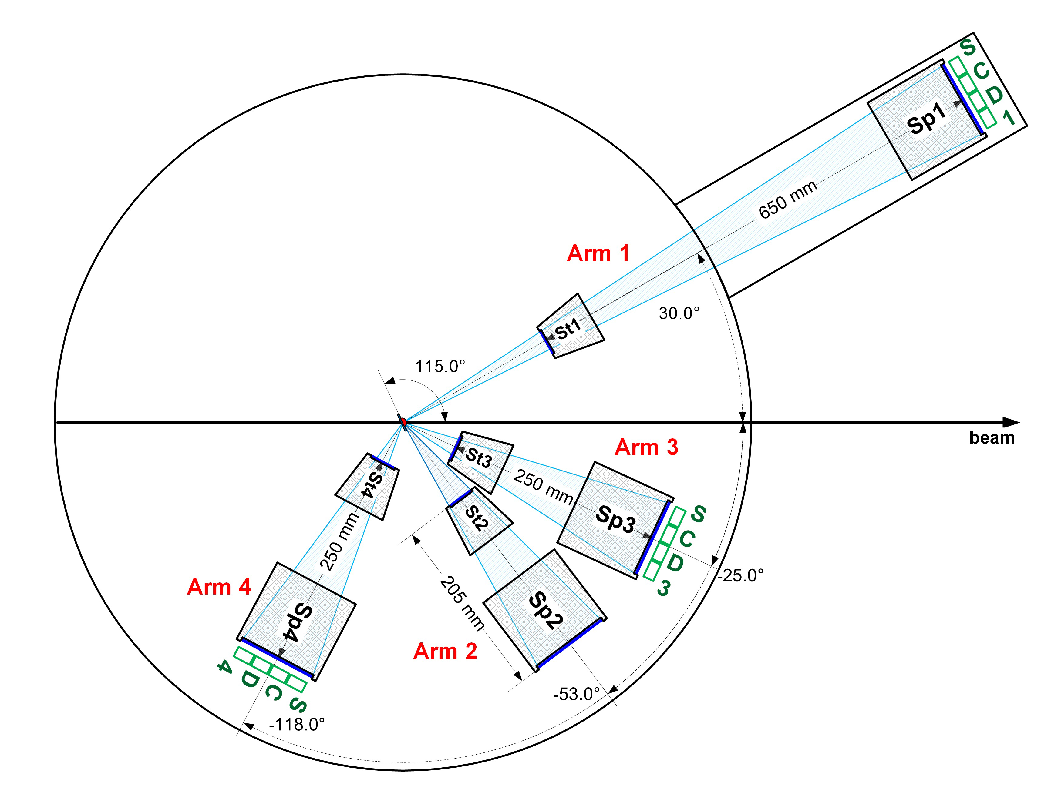 Рис. 1. Схема экспериментальной установки для исследований двух- и трехтельных кинематических процессов в реакции 136Xe+238U при энергии Elab = 1.11 ГэВ. “St” и “Sp” обозначают стартовый и стоповый детекторы на микроканальных пластинах, “SCD” – полупроводниковые детекторы