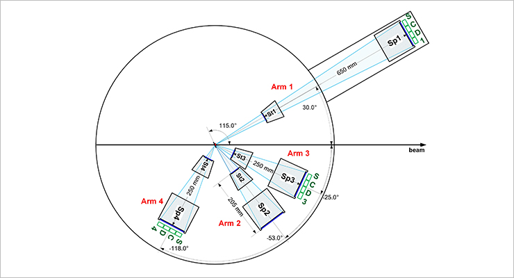 им. Г. Н. Флерова. Мишень 238U толщиной 200 мкг/см2, нанесенная на углеродную подложку толщиной 30 мкг/см2, облучалась ионами 136Xe и 209Bi. Продукты реакции измерялись с помощью спектрометра CORSET с применением двух независимых экспериментальных методов, а именно, двухплечевых измерений времени пролета (метод ToF-ToF) для исследования двухчастичных совпадений и скоррелированных трехплечевых измерений времени пролета и энергии (метод ToF-E) для исследования трехчастичных совпадений. Схема установки для измерения MNT фрагментов реакции 136Xe+238U приведена на Рис. 1.