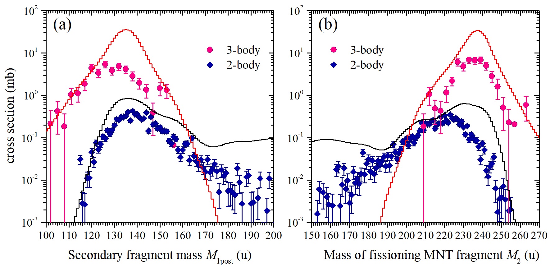 Рис. 2. (a) Массовые распределения вторичных PLF при двух- и трехтельных совпадениях фрагментов (синие и розовые точки), образованных в реакции 136Xe+238U при энергии Elab = 1.11 ГэВ; (b) Массовые распределения первичных TLF для двух- и трехтельных совпадений, дополнительных к PLF при тех же самых углах регистрации. Линии представляют соответствующие теоретические расчеты