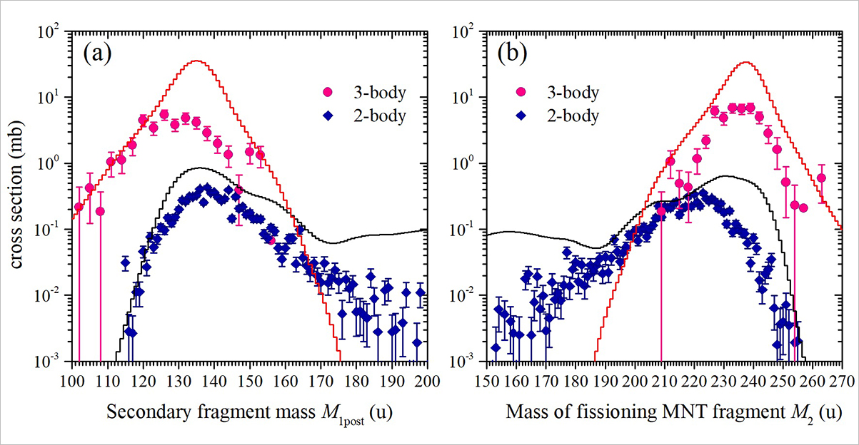 Один из основных результатов данного исследования показан на Рис. 2: массовое распределение для вторичных PLF для случая, когда зарегистрировано совпадение с обоими фрагментами последовательного деления комплементарного TLF (3-частичные совпадения), и массовое распределение PLF, для которого зарегистрирован выживший тяжелый фрагмент (двухтельные совпадения). Видно, что для фрагментов MNT с массой более 212 а. е. м. процесс девозбуждения образовавшихся возбужденных фрагментов MNT протекает в основном через их последовательное деление, что приводит к формированию трех продуктов реакции. Линии представляют собой теоретические массовых распределений. В то время как теория предсказывает более высокие сечения выживших тяжелых фрагментов MNT с массой 220–250 а. е. м. по сравнению с экспериментальным, предсказанные массовые выходы для фрагментов MNT, испытывающих деление, хорошо согласуются с измеренным спектром.