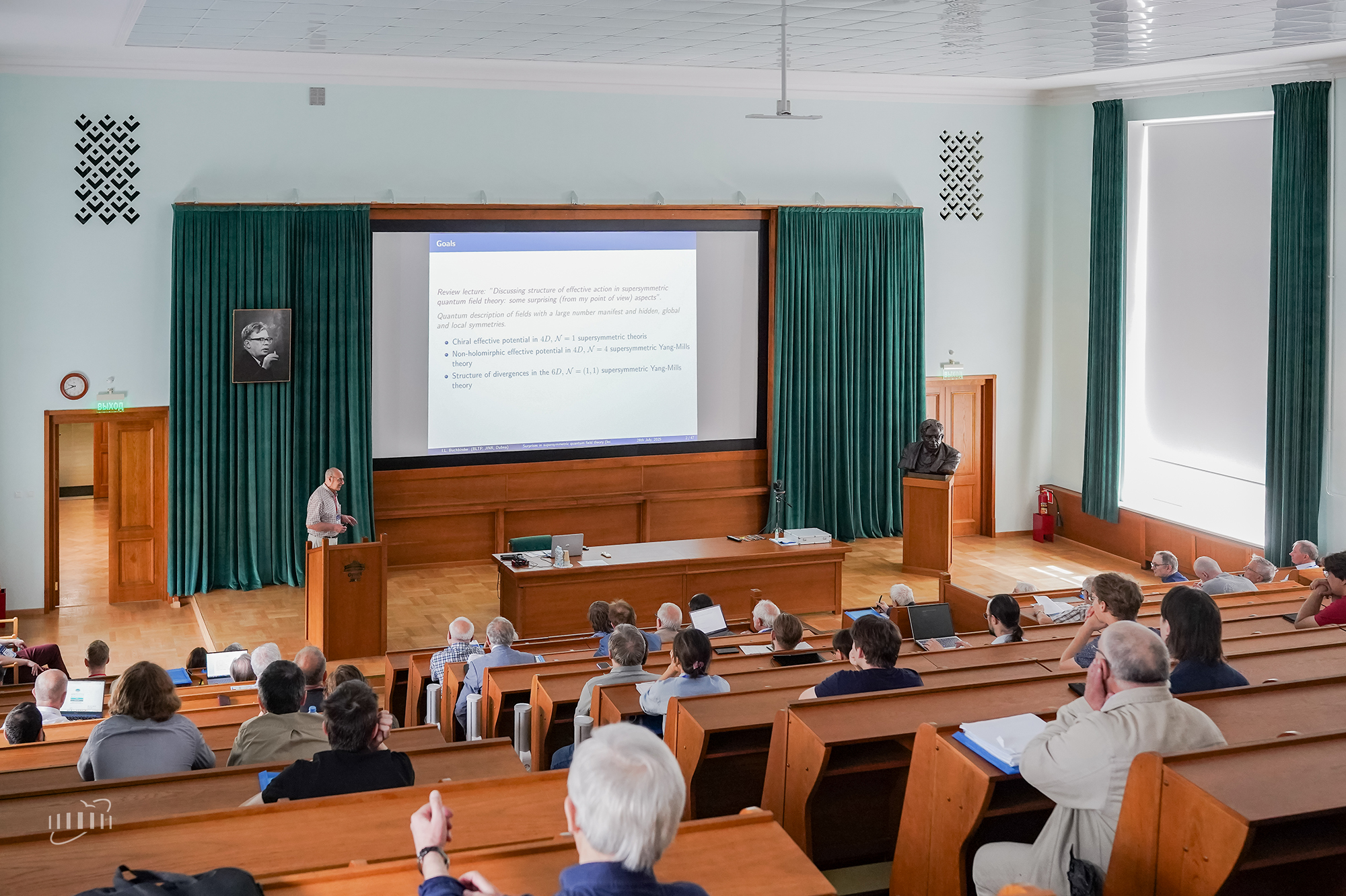 Выступая с приветственным словом перед участниками конференции, директор ЛТФ ОИЯИ Дмитрий Казаков подчеркнул особую роль квантовой теории поля (КТП) для теоретиков из Дубны и напомнил о значительном вкладе в исследования этой области отцов-основателей Объединенного института — Николая Боголюбова и Дмитрия Блохинцева. «Квантовая теория поля успешно развивается на протяжении более 50 лет, — отметил он. — Наше мероприятие сегодня продолжает традиции международных конференций по КТП, которые ранее проводились в Томске и Дубне, объединяя ведущих ученых и молодых специалистов».