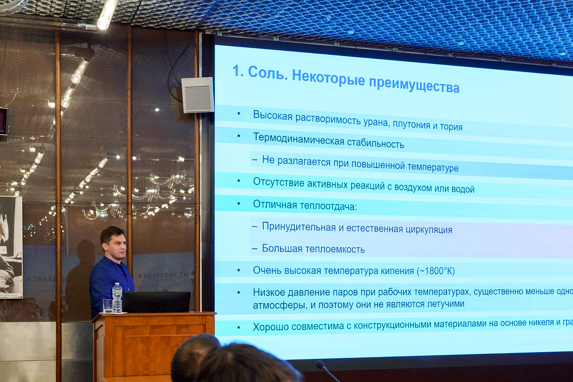С лекцией «Исследования по выбору и обоснованию материалов ЖСР» выступил старший научный сотрудник отделения «Реакторный исследовательский комплекс» АО «ГНЦ НИИАР» Павел Палачев. В своем выступлении он подробно осветил вопросы, связанные с работой жидкосолевых реакторов (ЖСР), включая назначение и свойства соли в ЖСР-реакторах, а также направления и результаты исследований, проводимых на реакторе СМ-3 в Димитровграде.