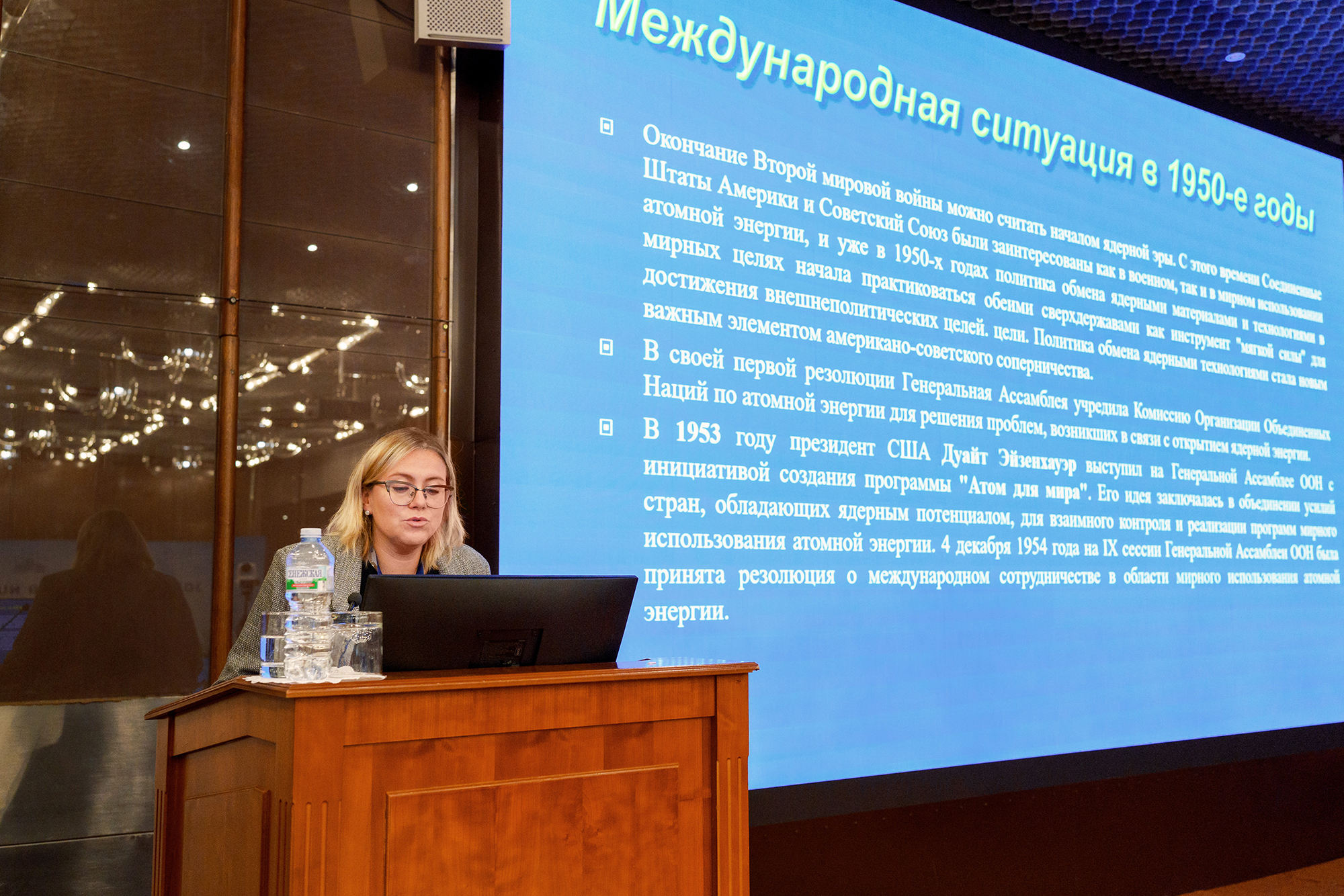 Об истории создания Объединенного института ядерных исследований рассказала заместитель руководителя департамента международного сотрудничества ОИЯИ Елена Бадави. В ходе ее выступления были отмечены ключевые события мировой истории, которые предшествовали появлению ОИЯИ, в том числе переход от атомной дипломатии к научной. Елена Бадави также представила вехи развития международного научного сотрудничества Института в 20 веке, подчеркнув особую роль ОИЯИ как площадки для демонстрации достижений советской и мировой науки.