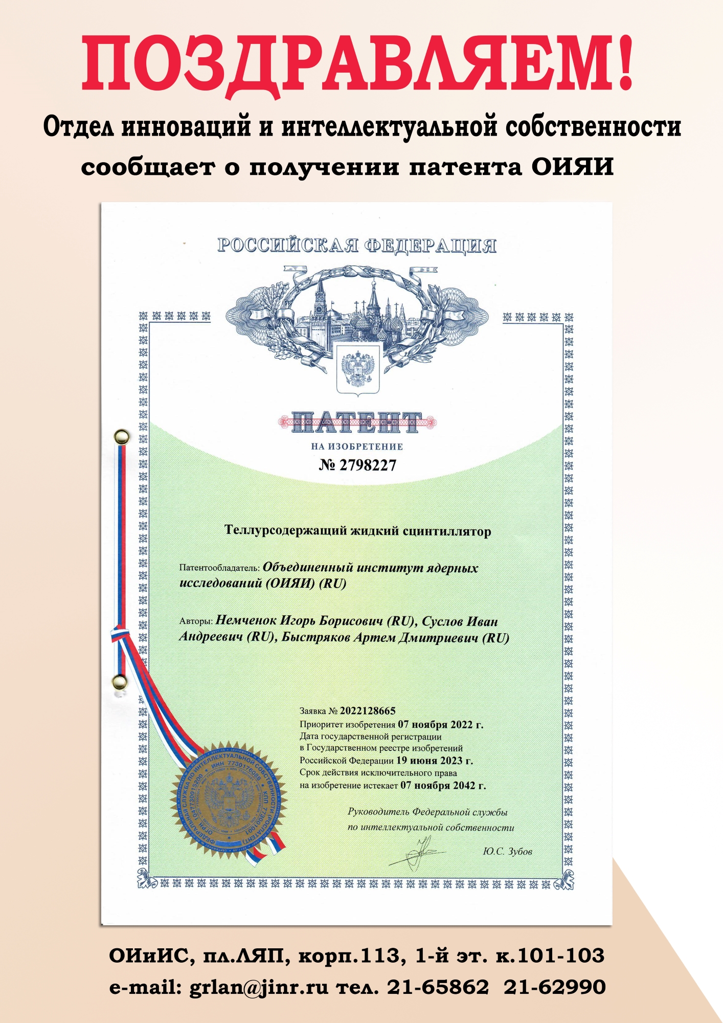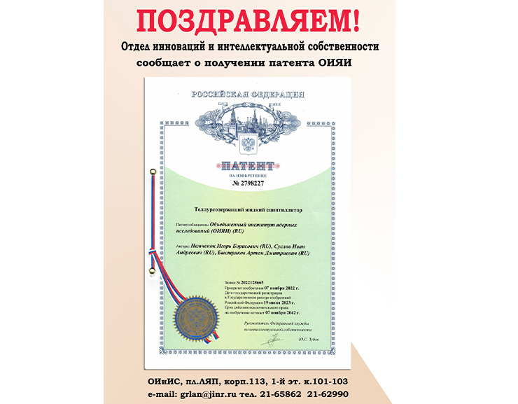 19 июня 2023 года ученые ОИЯИ получили патент на жидкий сцинтиллятор на основе линейного алкилбензола с содержанием теллура. Как подчеркивают ученые, 130Te, используемый в разработке, – наиболее перспективная разновидность теллура и любых других элементов для экспериментов по поиску безнейтринного двойного бета-распада.