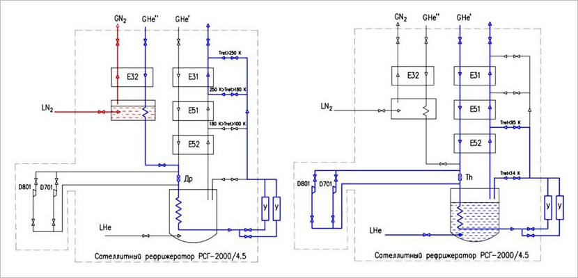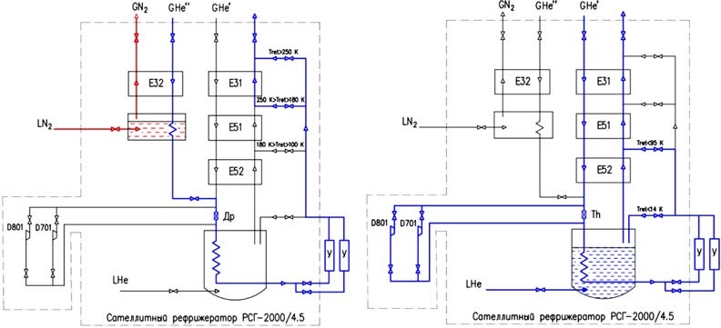 Рис. 1. Принципиальная схема охлаждения бустера: первый (слева) и второй (справа) этапы охлаждения