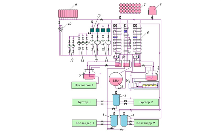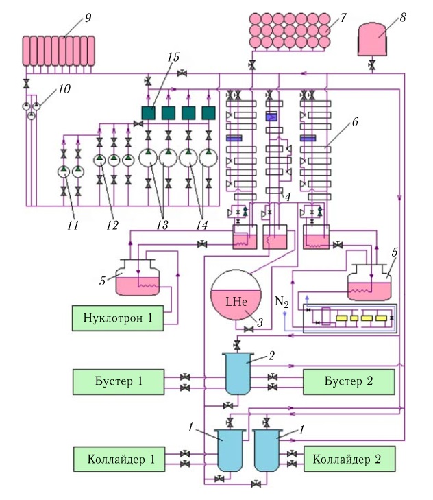 Рис. 2. Схема системы криогенного гелиевого обеспечения ускорительного комплекса NICA: 1 — сателлитный рефрижератор коллайдера; 2 — сателлитный рефрижератор Бустера; 3 — криогенная гелиевая цистерна; 4 — гелиевый ожижитель; 5 — сепаратор Нуклотрона; 6 — гелиевый рефрижератор; 7, 8 — газгольдеры; 9 — ресиверы сжатого гелия; 10, 11, 12 — поршневые компрессоры; 13, 14 — винтовые компрессорные агрегаты; 15 — блок маслоочистки и осушки