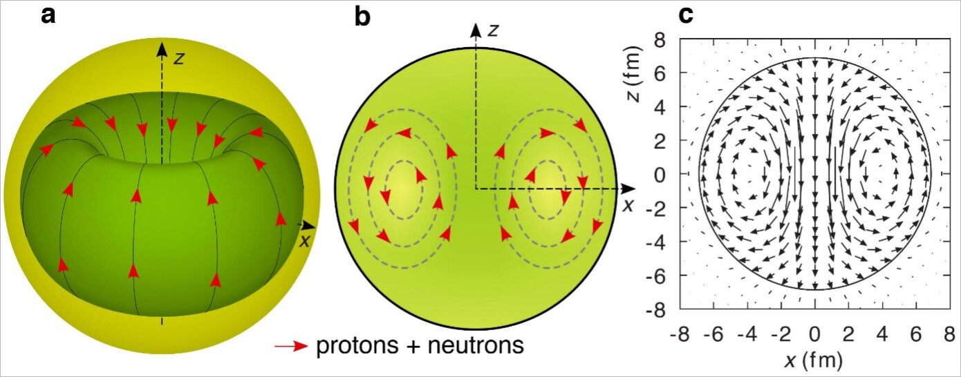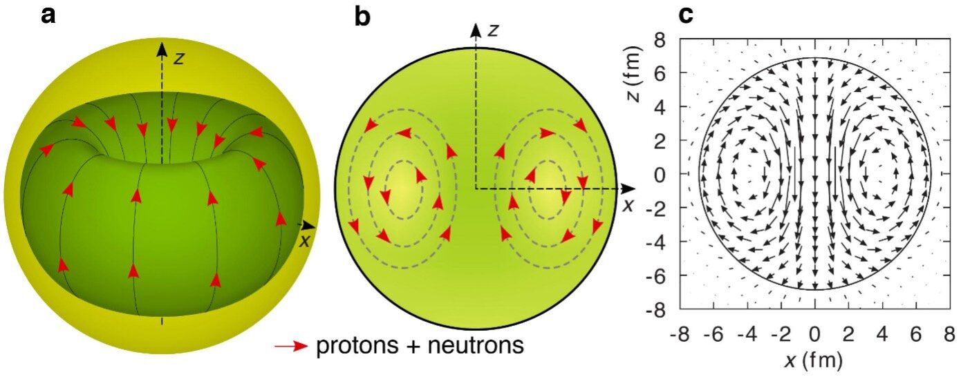 a) схематическое 3D-изображение токов на поверхности тора; b) изображение 2D-сечения в плоскости xz; c) теоретическое предсказание распределения тока тороидальной электрической дипольной моды в ядре