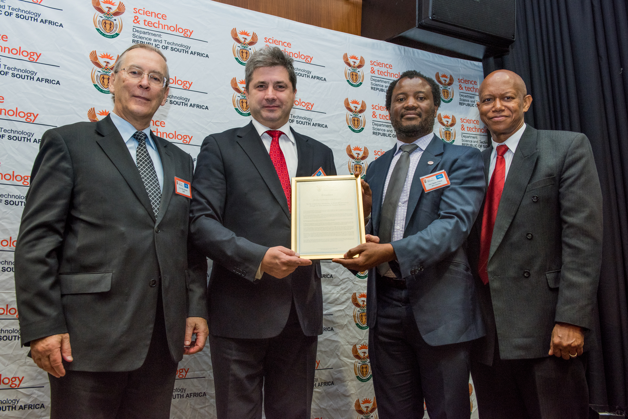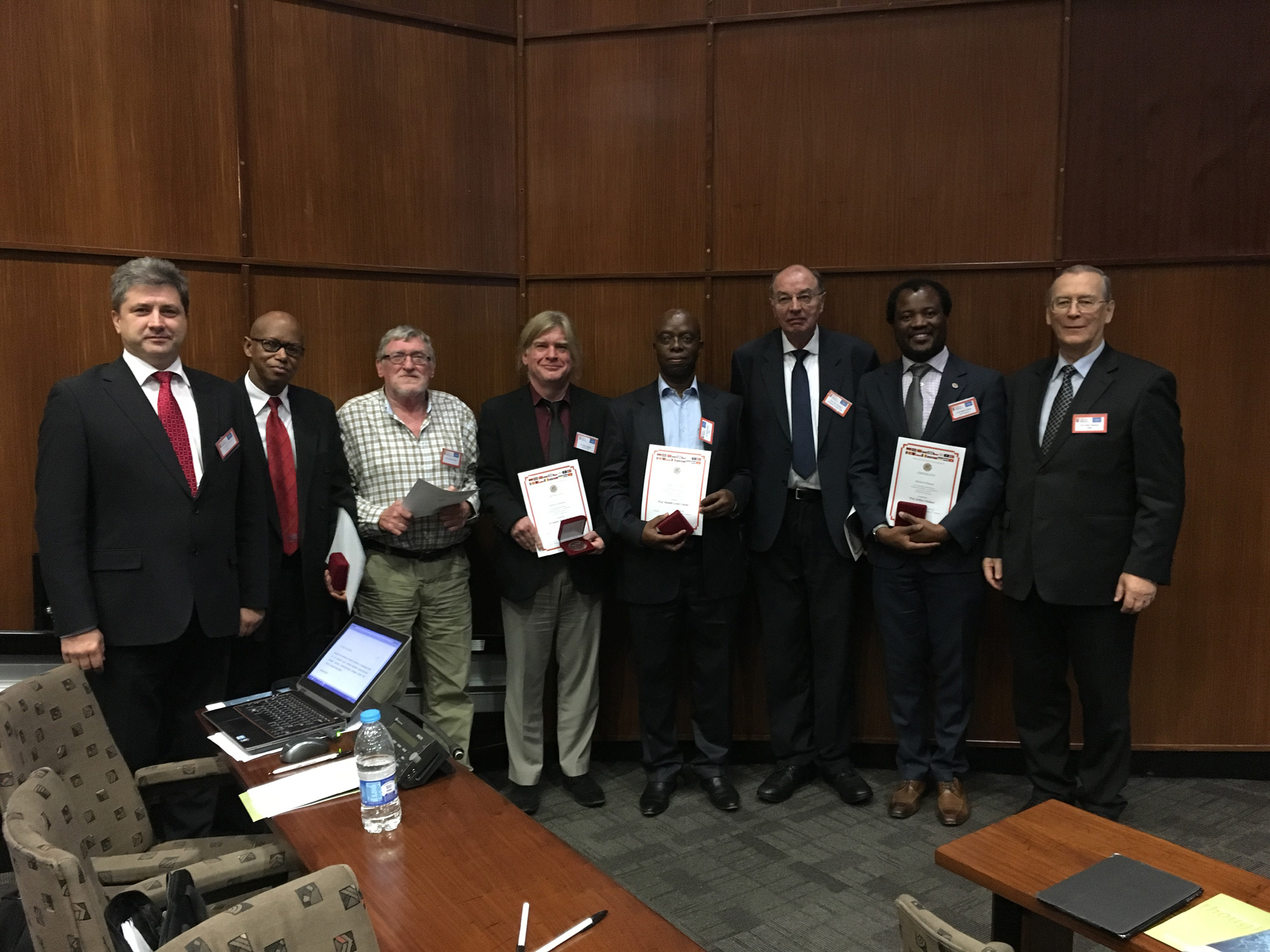 После вступительного слова директора ОИЯИ В.А. Матвеева о статусе ОИЯИ на сегодняшний день и о его прогнозируемом будущем, состоялась торжественная церемония награждения за большой вклад в сотрудничество между ЮАР и ОИЯИ. В.А. Матвеев вручил памятные дипломы и медали генеральному директору Департамента новых направлений исследований и инфраструктуры DST Дениэлю Адамсу, проф. Арно Фанхофу, руководителю отдела Лаборатории iThemba LABS, д-ру Саймону Муллинсу, д-ру Лесли Лекала (Университет Южной Африки, UNISA), проф. Жану Клеймансу (Университет Кейптауна), проф. Университета Западного Кейпа (UWC) и координатору прикладных исследований в сотрудничестве ЮАР-ОИЯИ Лесли Петрик, а также члену Программно-консультативного комитета ОИЯИ по ядерной физике, проректору университета WITS по науке, проф. Зеблону Вилакази.
