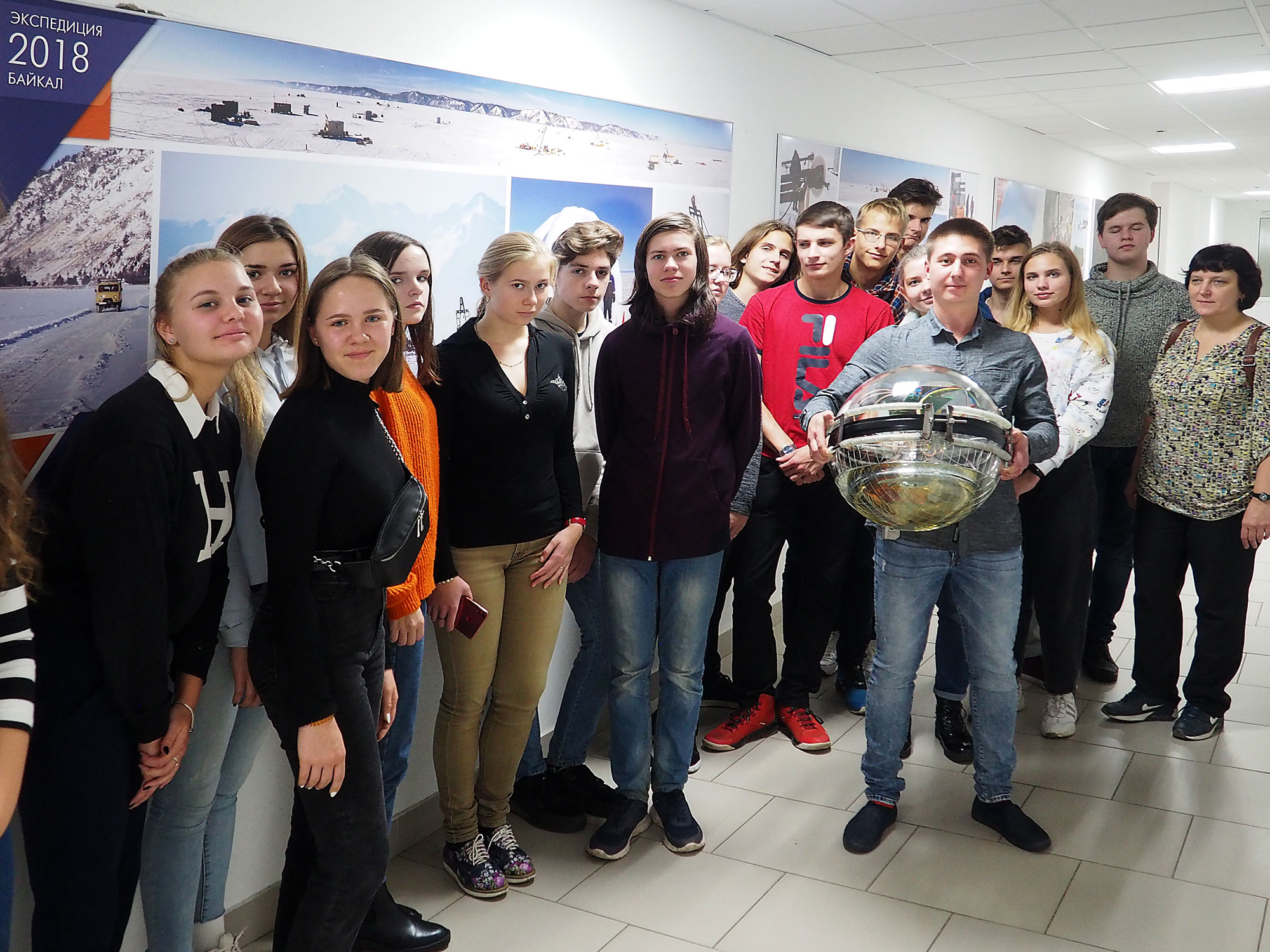 Инженер Лаборатории ядерных проблем М. Сороковиков рассказал учащимся об эксперименте на озере Байкал, где работает глубоководный нейтринный телескоп и провел экскурсию по залу сборки оптических модулей, с помощью которых уже в ближайшем будущем ученые смогут «поймать» следы нейтрино, приходящих к нам из далеких глубин Вселенной. Школьники ознакомились с фотографиями, сделанными в 2018 году в ходе зимней байкальской экспедиции специалистов ОИЯИ.