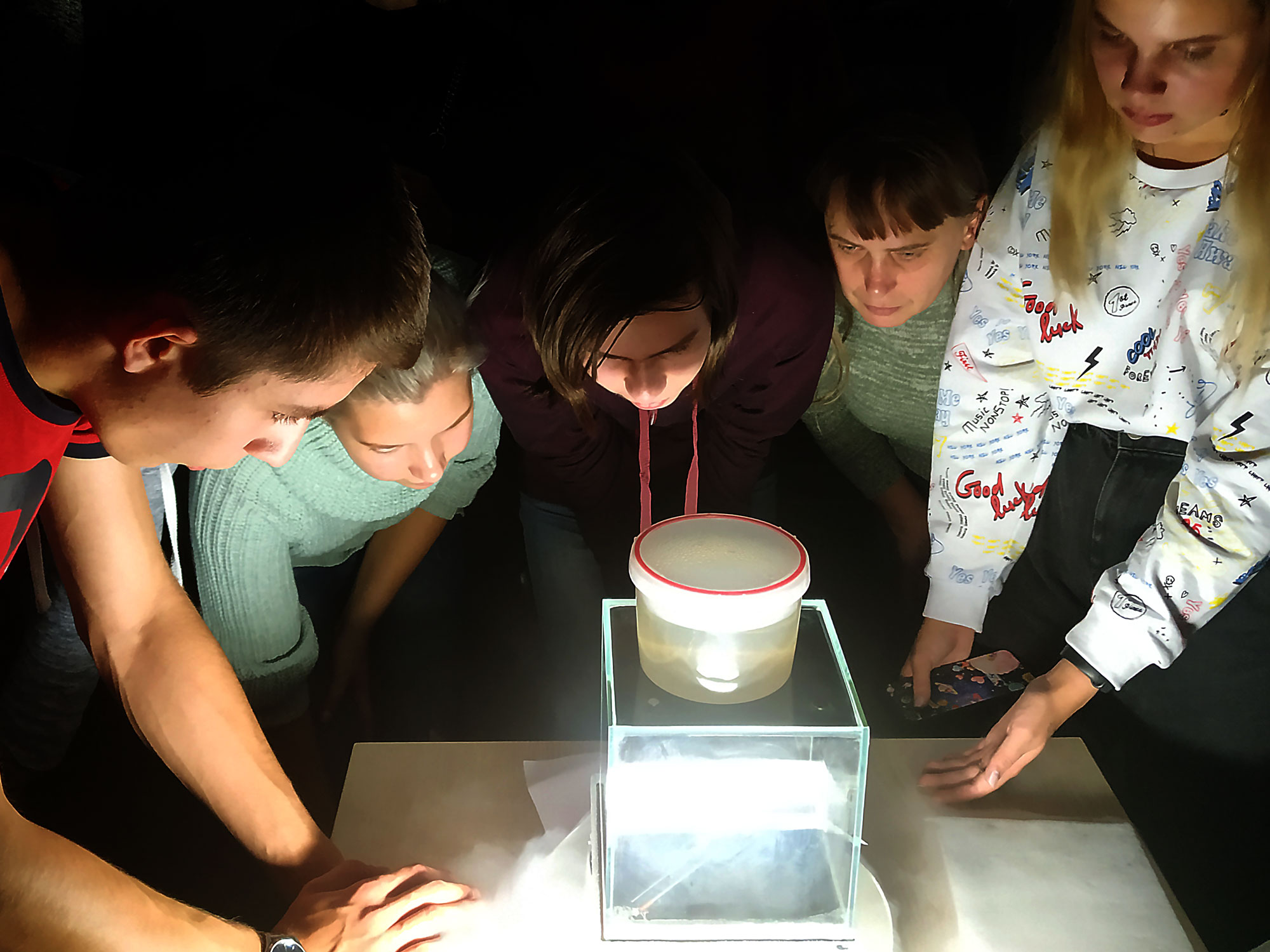 Мы побывали в настоящем исследовательском центре, смогли посмотреть на работу ученых, поговорить с ними о сложном на простом языке. Нам показали современное оборудование, объяснили принципы его работы, а также продемонстрировали его возможности. В «Темной комнате» мы провели очень интересные физические опыты, например, наблюдали треки альфа-частиц и левитацию сверхпроводника в магнитном поле. Нам рассказали о работе фотоумножителей, используемых при регистрации элементарных частиц.