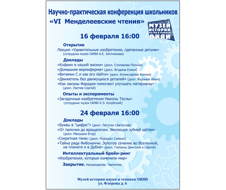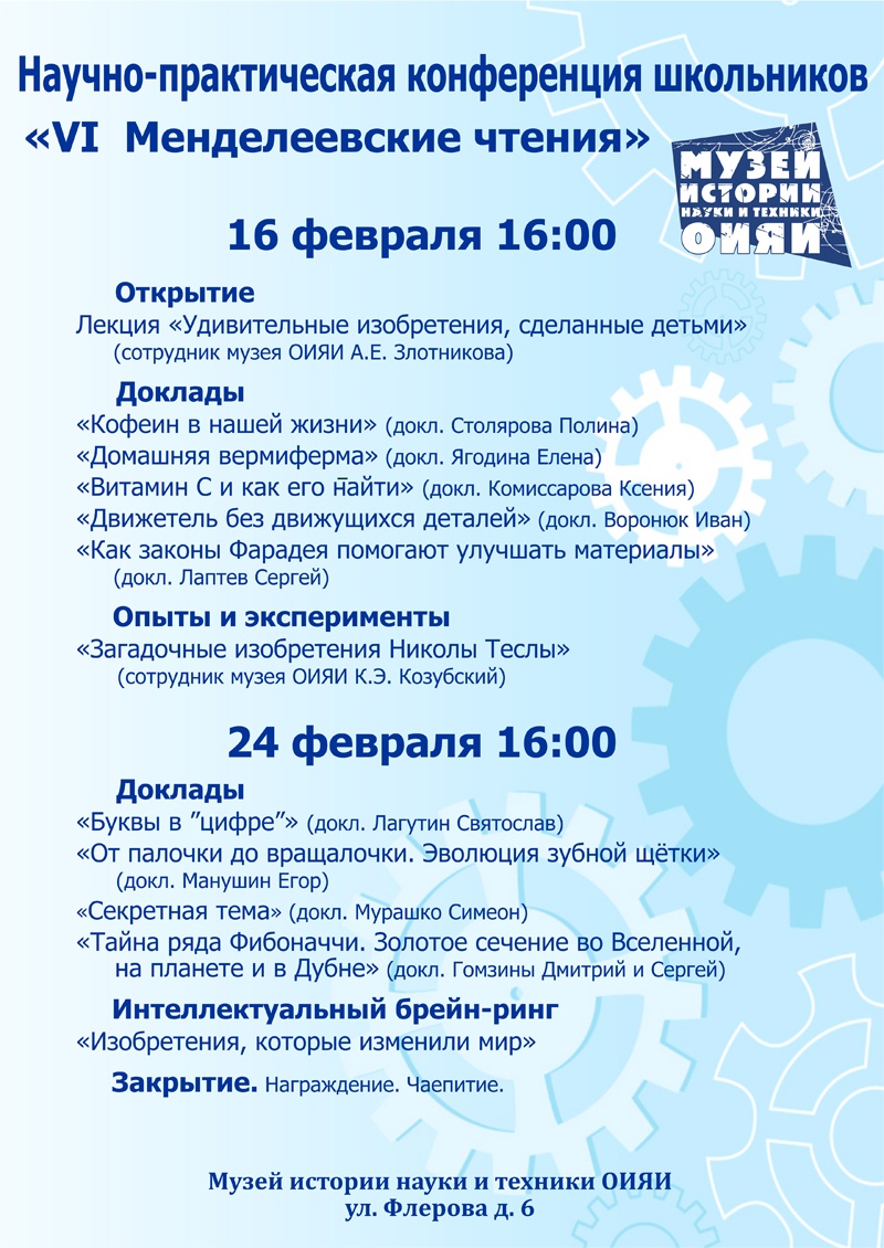 Музей истории науки и техники ОИЯИ объявляет очередные VI Менделеевские чтения для школьников!