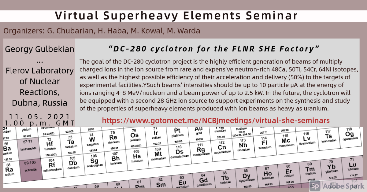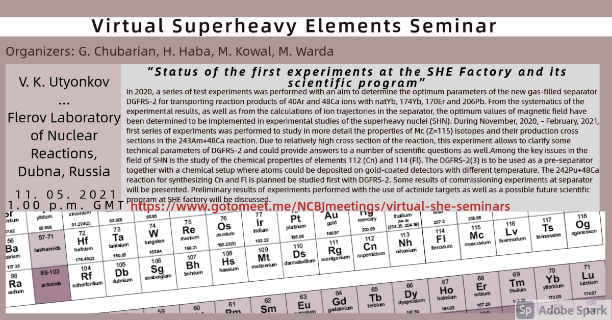 Пандемия коронавируса замедлила международное общение, и множество конференций отменилось. Несмотря на это исследования сверхтяжелых элементов продолжались, и появлялись новые результаты. В связи с этим Национальный центр ядерных исследований (NCBJ, Польша) организовал серию виртуальных семинаров, посвященных данной тематике.
